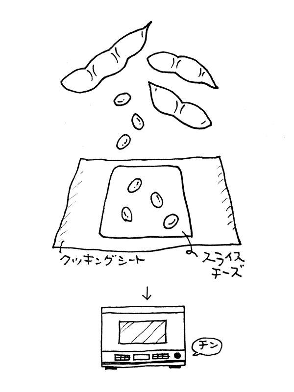 1.クッキングシートにスライスチーズを乗せ、サヤから出した枝豆を散らす。