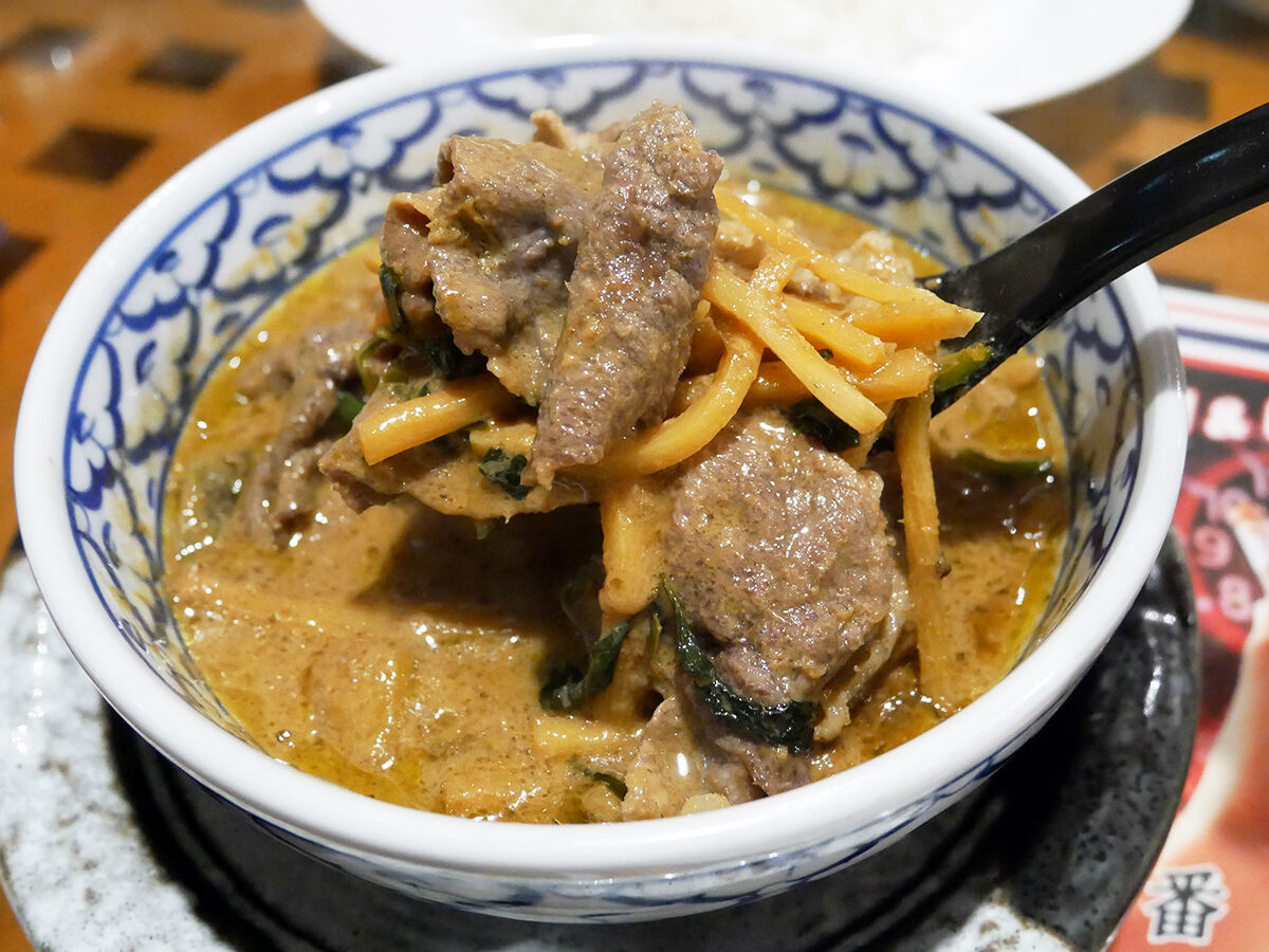 ココナッツミルクのまろやかさの後にしっかりスパイス香る、そして肉の旨味がグイグイ押し寄せる。はい、おいしい!