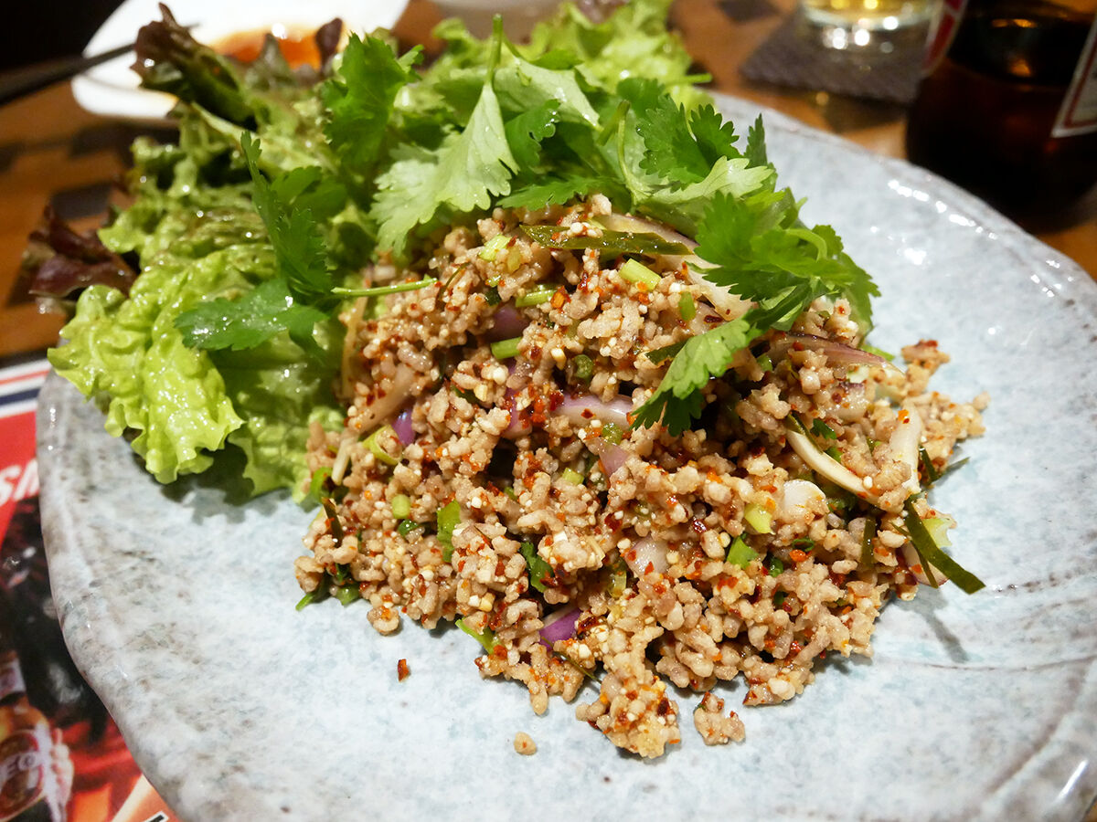 大好きラープも食べなきゃ。赤玉ねぎやパクチーに、ラープに必須の焼き米のプチプチ存在感もしっかり。