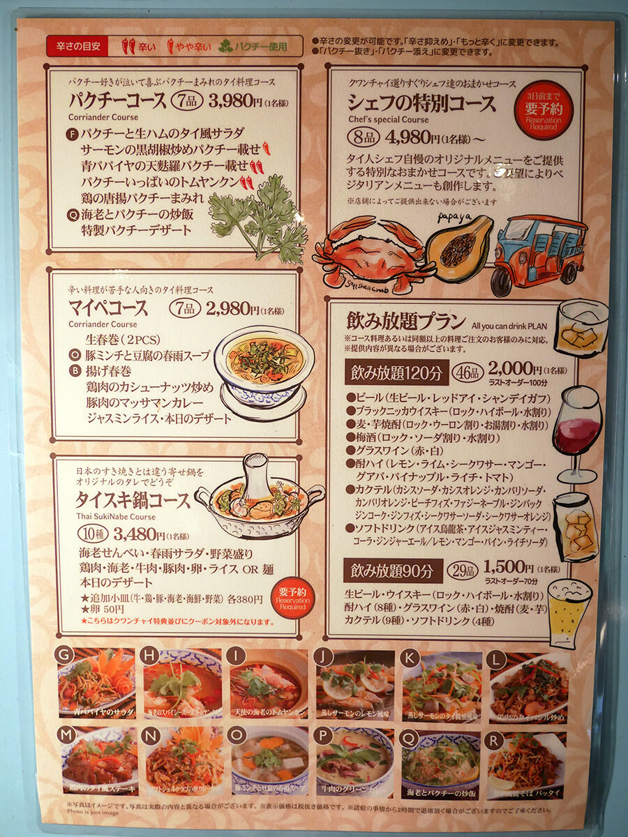 そんなメニューは手元ブックにて。写真入り、詳細や辛さレベルも記され、初心者さんにも安心。アラカルトの他、コースも豊富にスタンバイ。(詳細は記事最下部にてどうぞ。以下、価格は税別。)