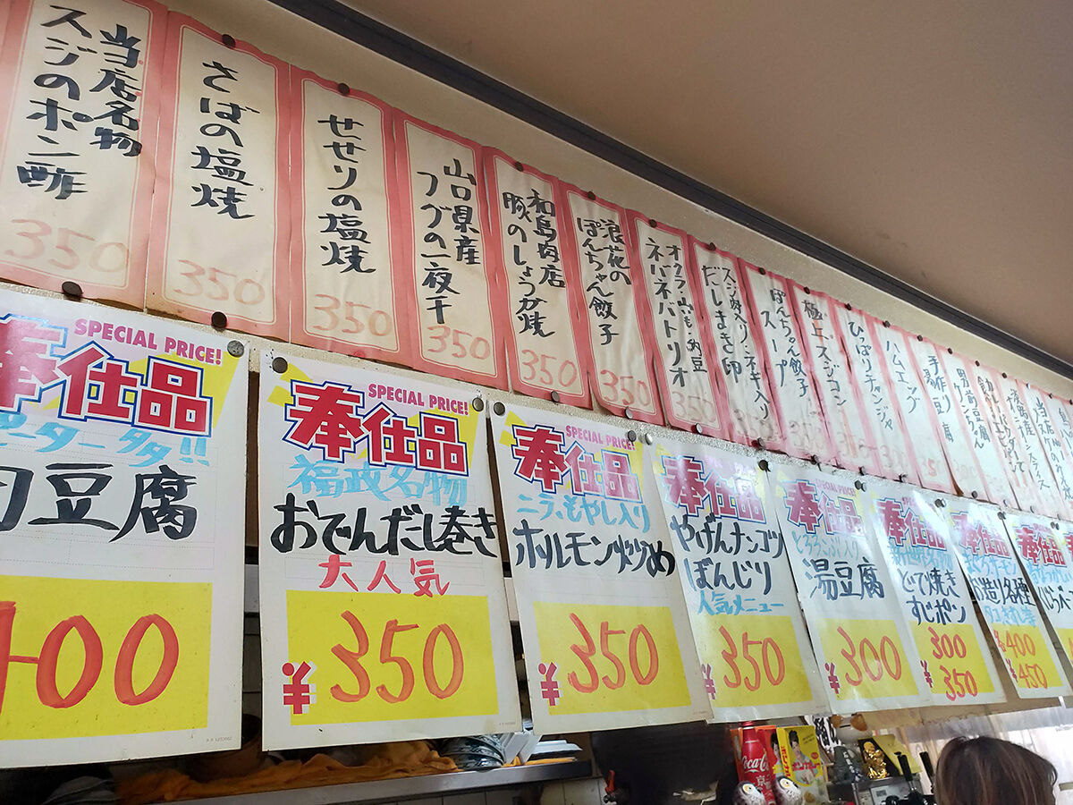 頭上のメニュー。『奉仕品』だらけ!酒場ってよりスーパーやん(笑)