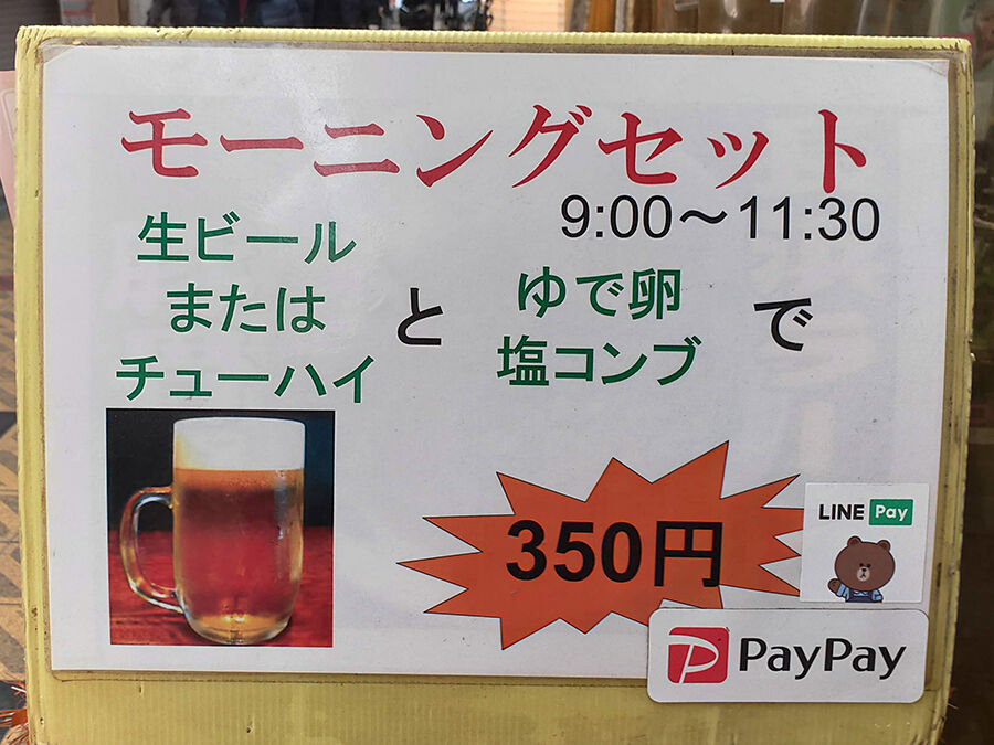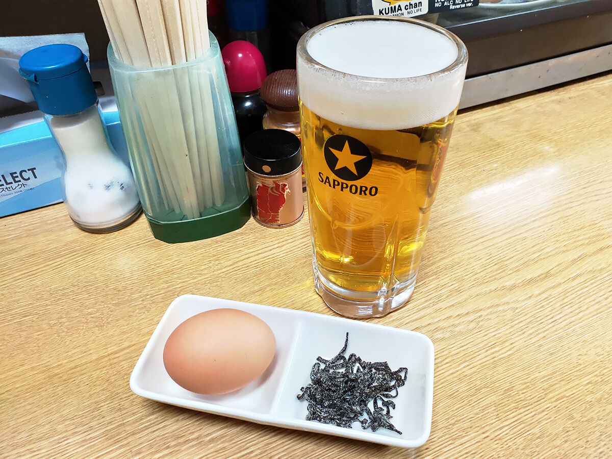 生ビールorチューハイに、ゆで卵と塩昆布という、何ともオツなセット。9時から11時半までの限定。(このセットに間に合うようにダッシュしたこともあったなぁ。笑)