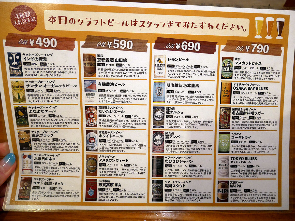 クラフトビールは日替わりで4種、¥490、¥590、¥690、¥790の4プライスからそれぞれ日とつずつ供されるもよう。ちなみにタップではなく、缶やビールスタイルみたい。