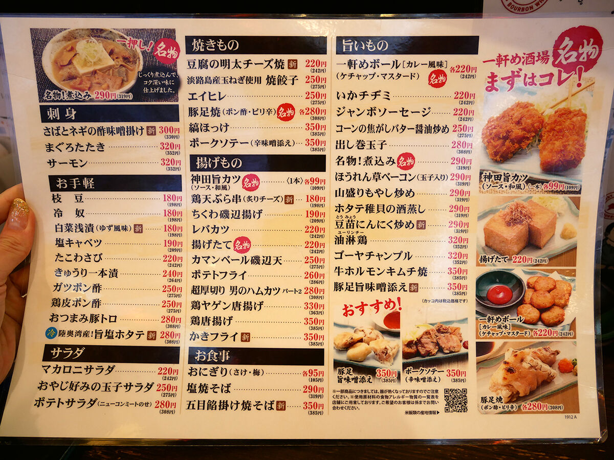 メニューは手元パウチと、頭上壁にて。あ、パウチが変わっている〜。定番に加えその日のオススメもある。(以下、価格は税別)