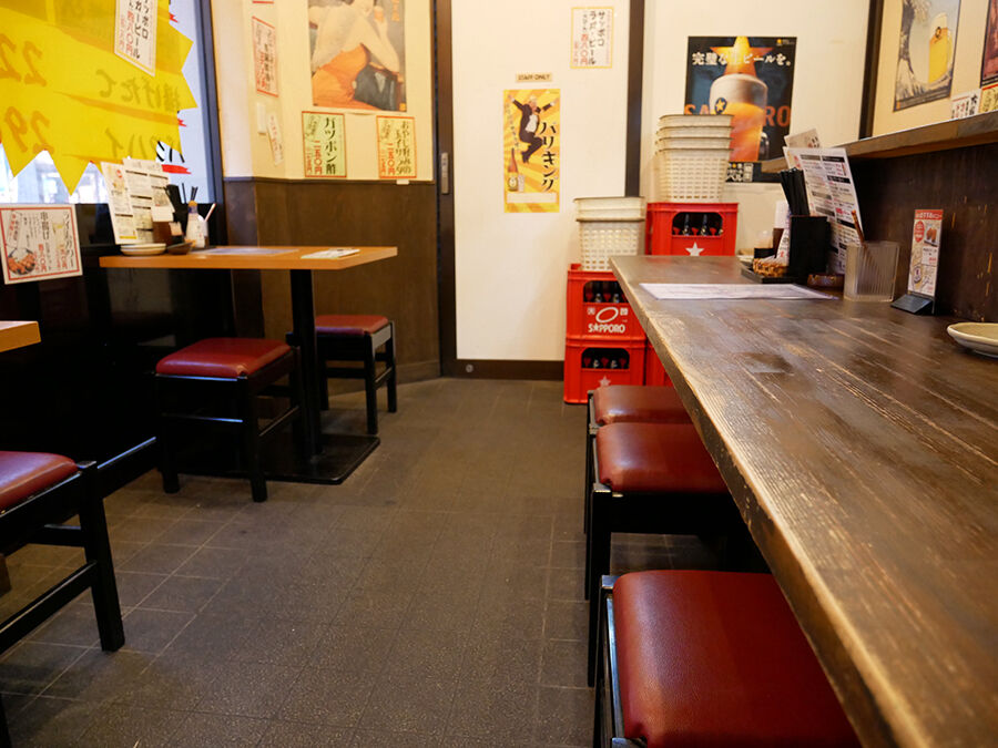 横長の店内は左手に調理場向かいのカウンターと、窓際のミニテーブル席。右手にはグループもOKなテーブル席。