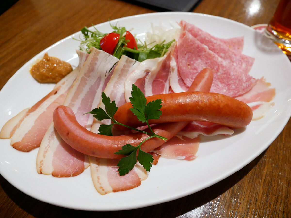 で、生ハム(サラダとかぶってしまったけど)・クラカワー(太いの)・ウインナー・ベーコン・ビアヴーストの5種盛り。