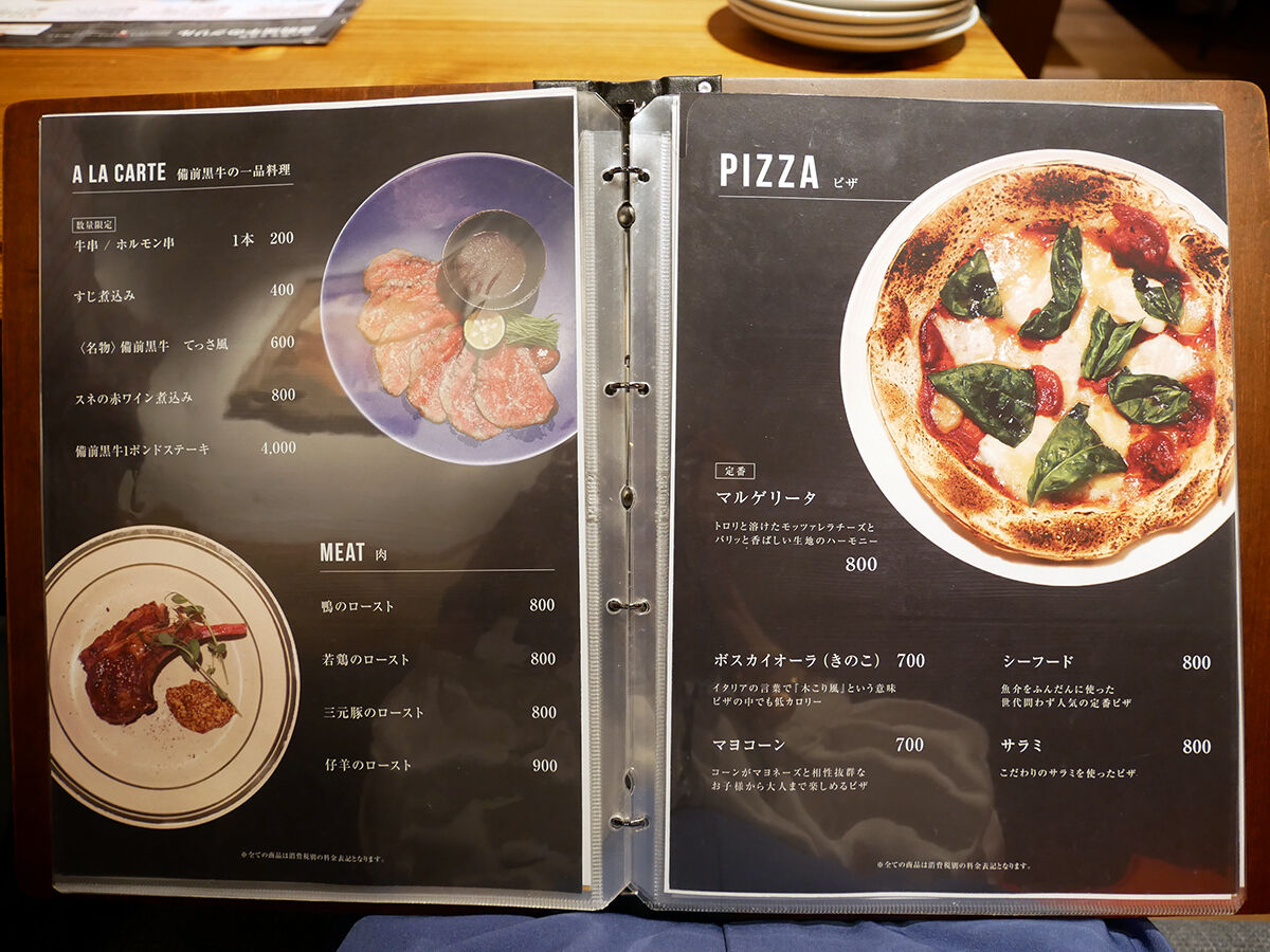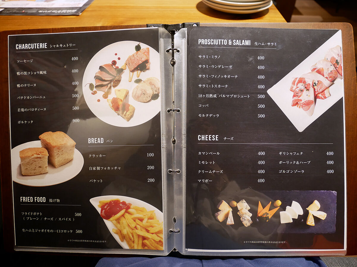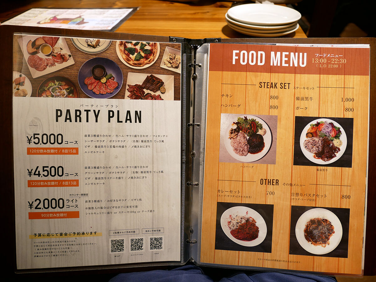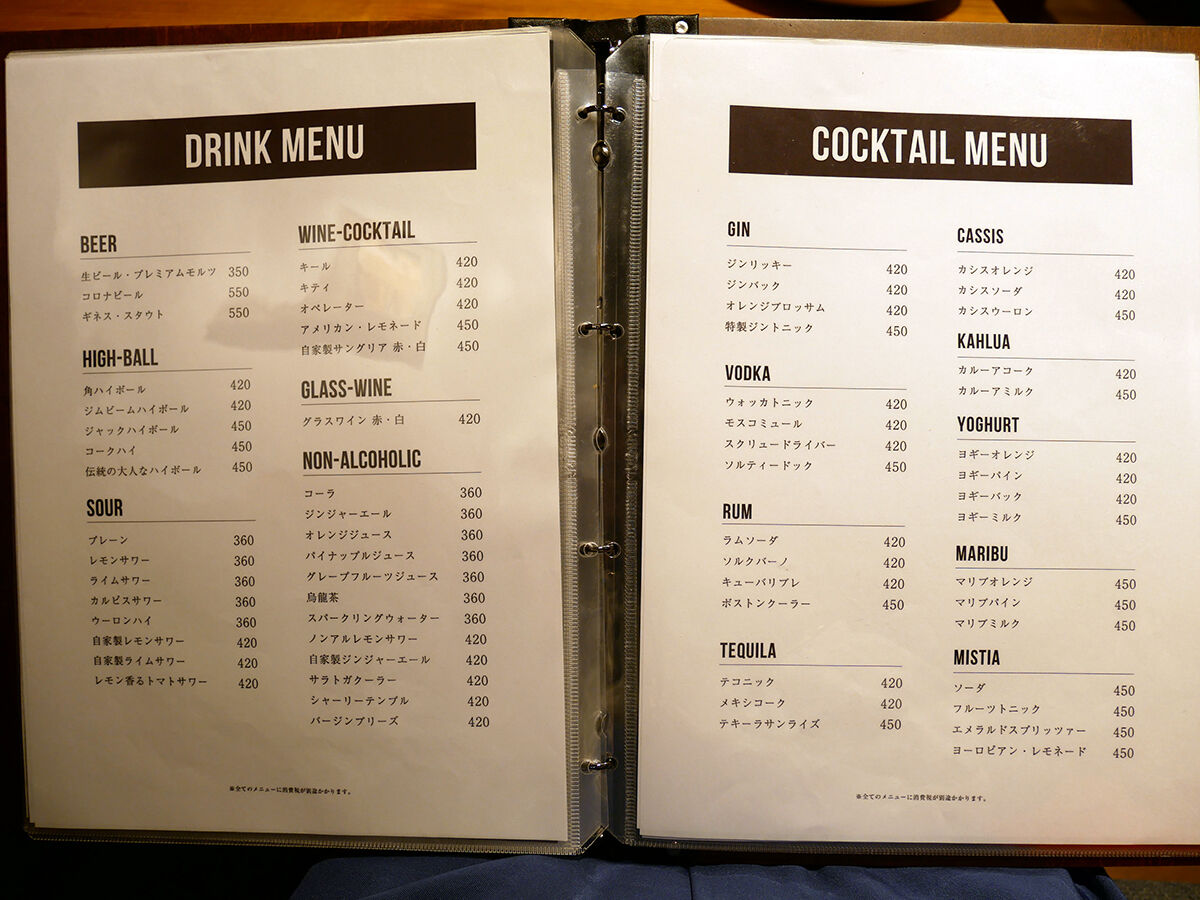 メニューは手元ブックにて。各種肉料理をメインに、前菜、サラダ、肉つまみ、ピザ、パスタ…などなどソソるラインナップ。合わせるお酒も定番に加え、ワインやカクテルが充実。(詳細は記事最下部にてどうぞ。以下、価格は税別。)