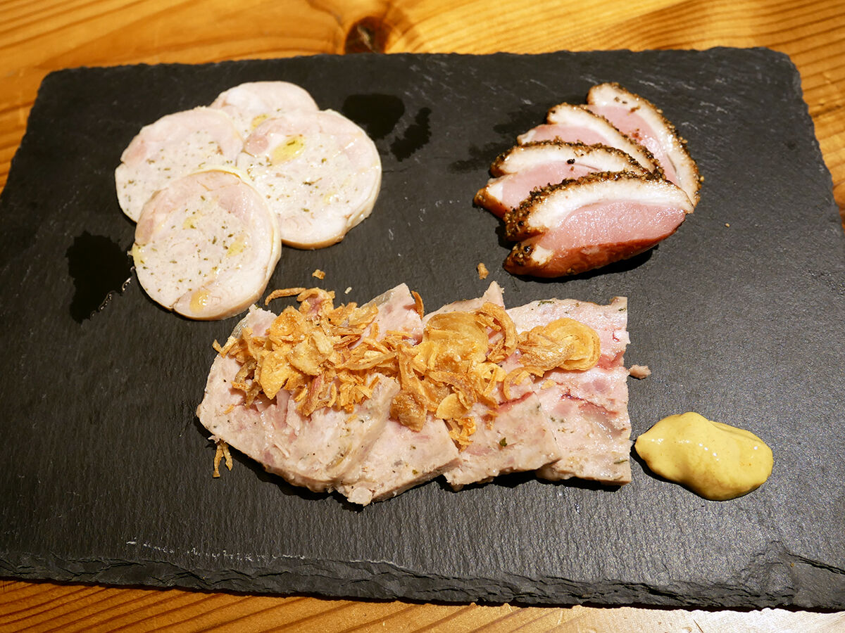 パテ・ド・カンパーニュ、鴨の黒コショウ風味、若鶏のバロティーヌ