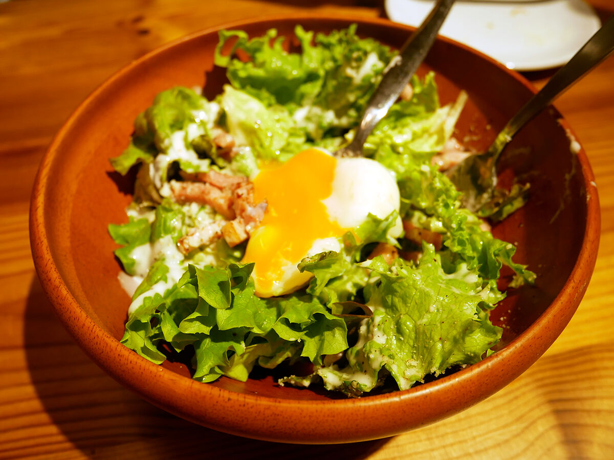 レタスとベーコンに温泉卵のシンプルさ。ドレッシングのバランスも◎