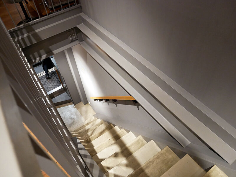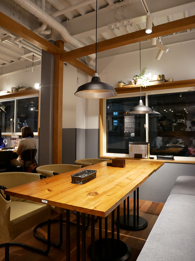 階段を上った2Fはライトが下がるテーブル席。シンプルスタイリッシュでこれまたオシャレ〜な雰囲気。