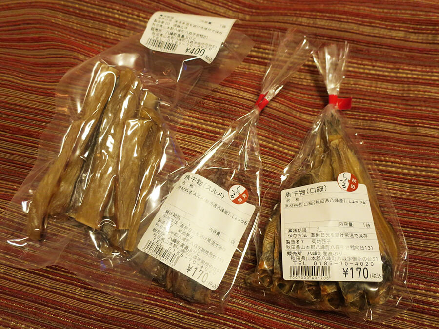 秋田の魚の干物。それぞれ秋田の魚醤<しょっつる>仕立て。