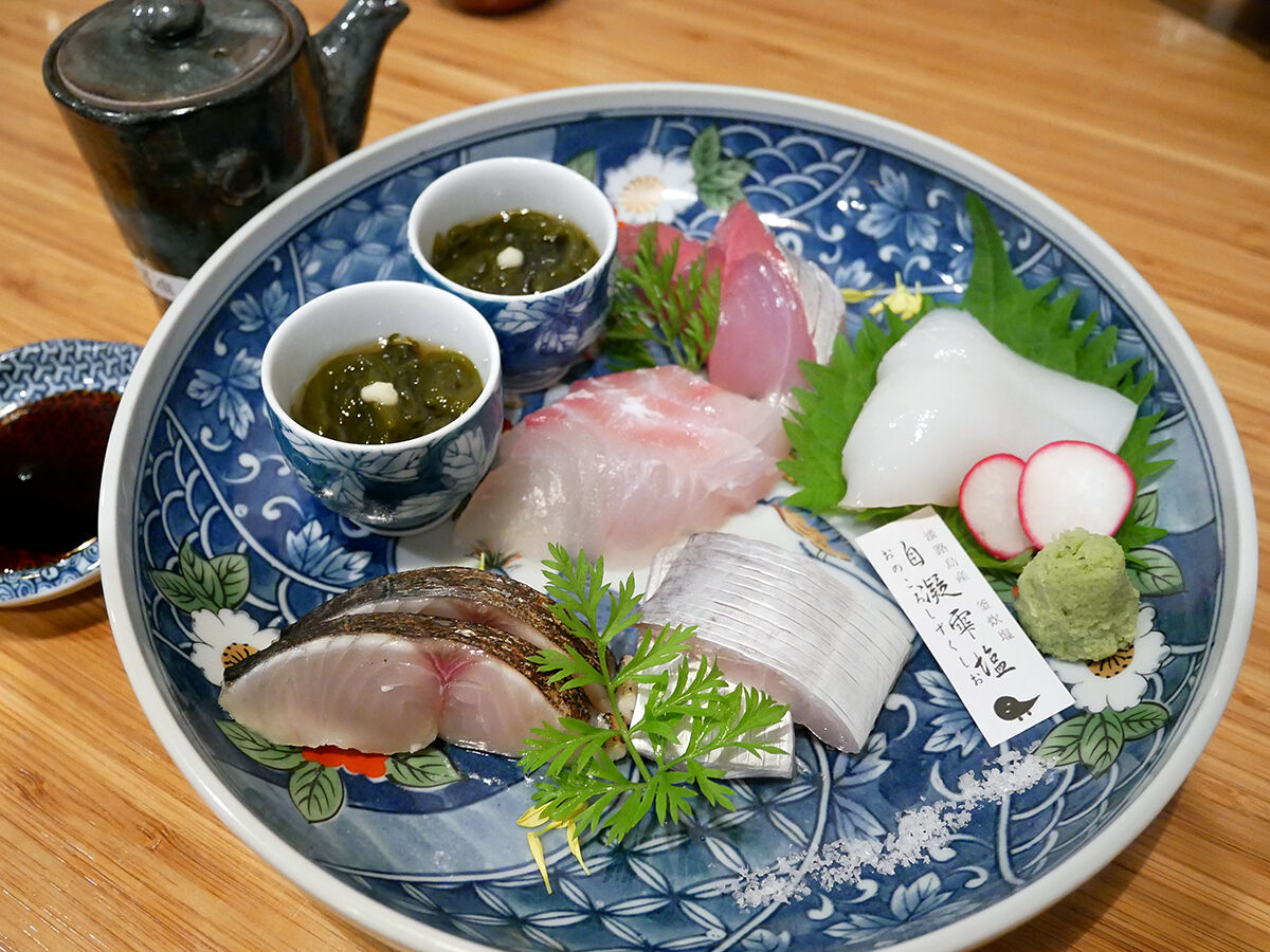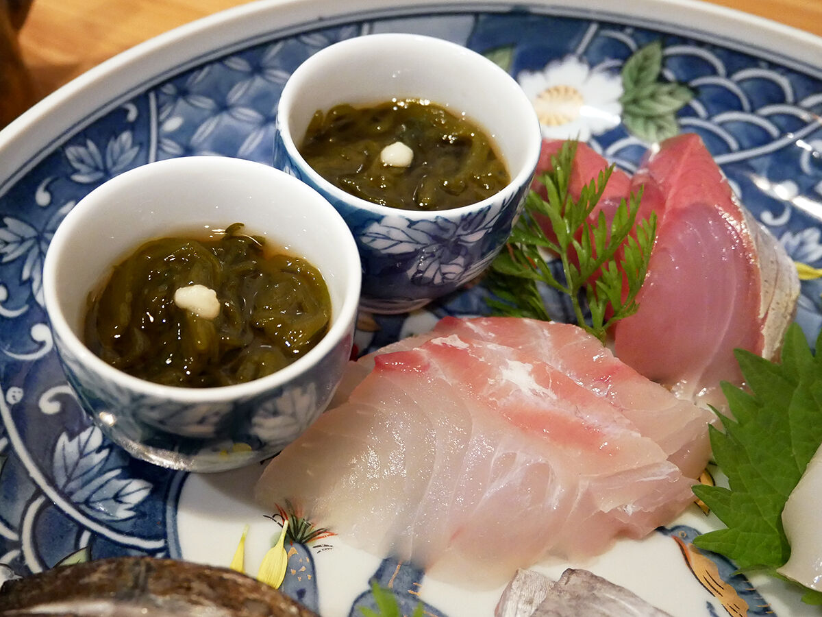 朝〆のサワラのきずし、フエダイ、ツバス、ハリイカ、タチウオ、淡路島産生もずく酢