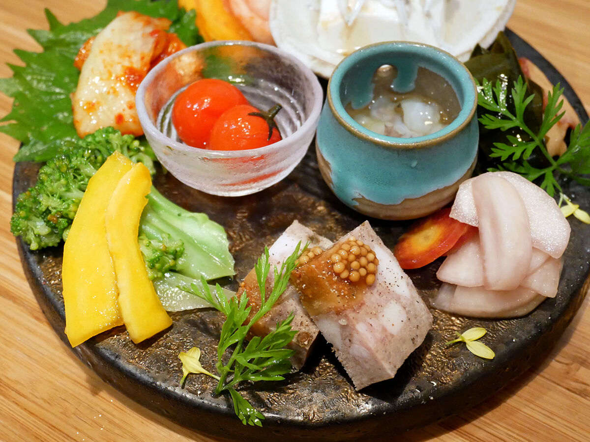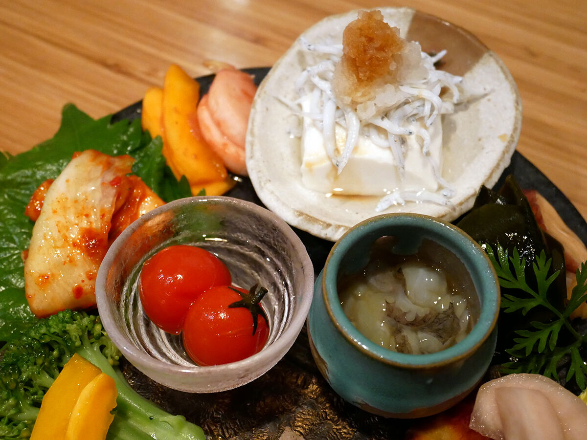 南あわじ釜揚げしらすの冷奴、たこわさ、トマトの蜜煮、自家製漬物、キムチ、コリンキーの梅和え、アンチョビ白菜、スティックブロッコリーのナムル、タコ炊いたん、山椒香るパテ・ド・カンパーニュ…