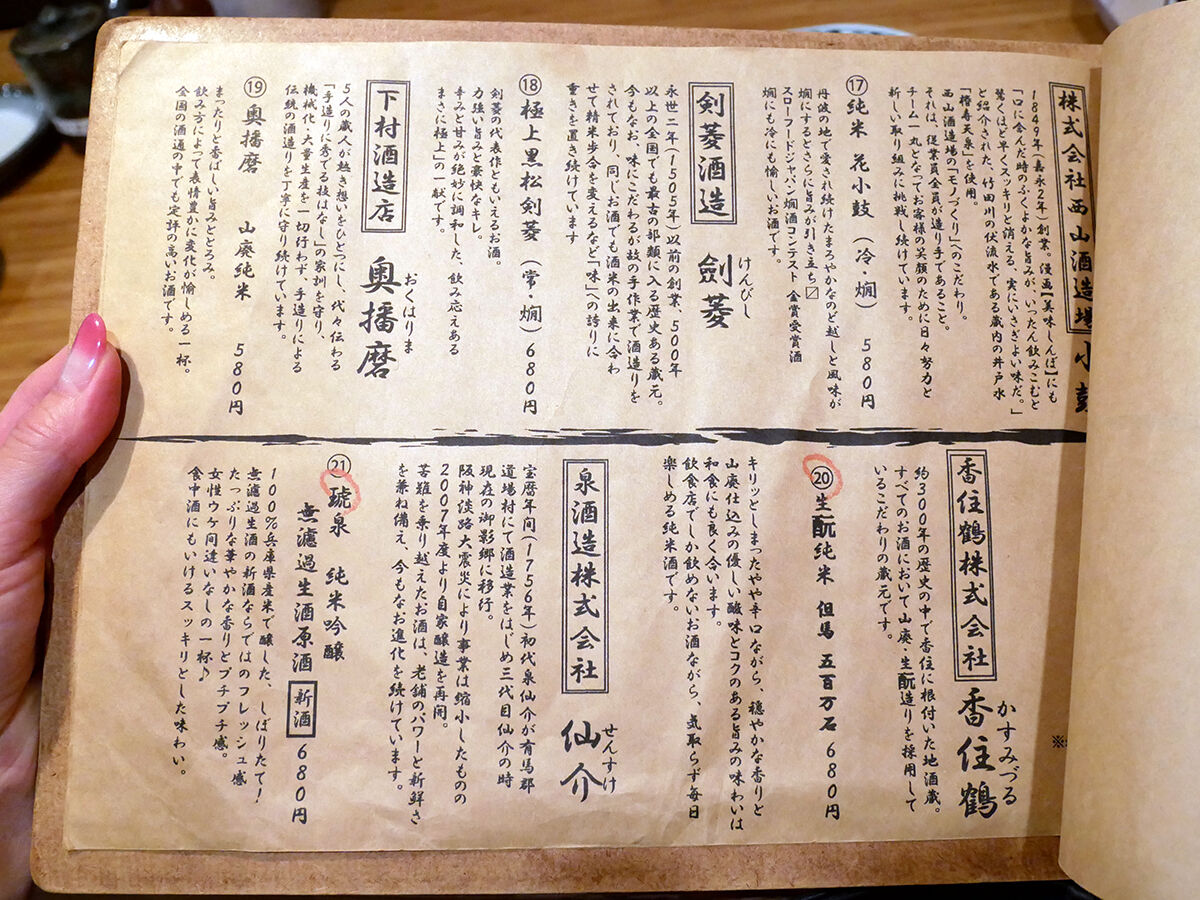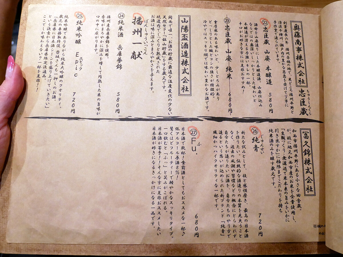 さてメニュー。先述通り、『兵庫の食と酒』がズラリ。尼崎ご出身のマスターが「兵庫県の魅力を広めたい!」と始められたそう。