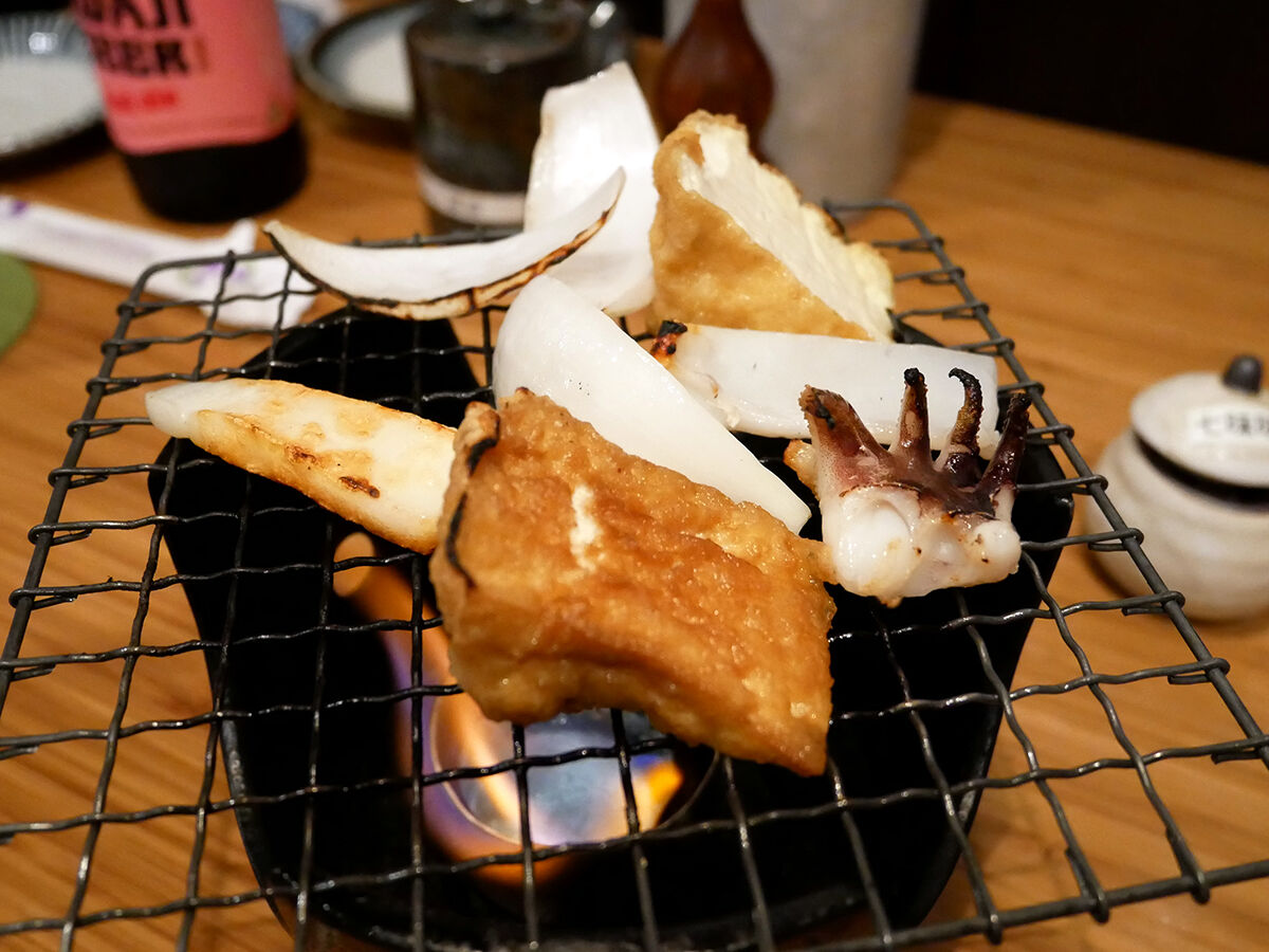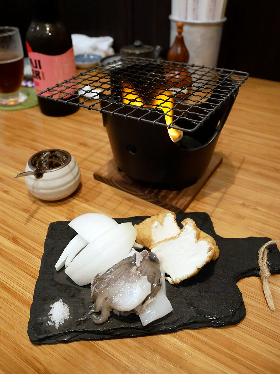 「お通しでーす」と運ばれてきたのは、七輪と食材。セルフで炙り入れるスタイル、粋やねぇ。こんなん好き。
