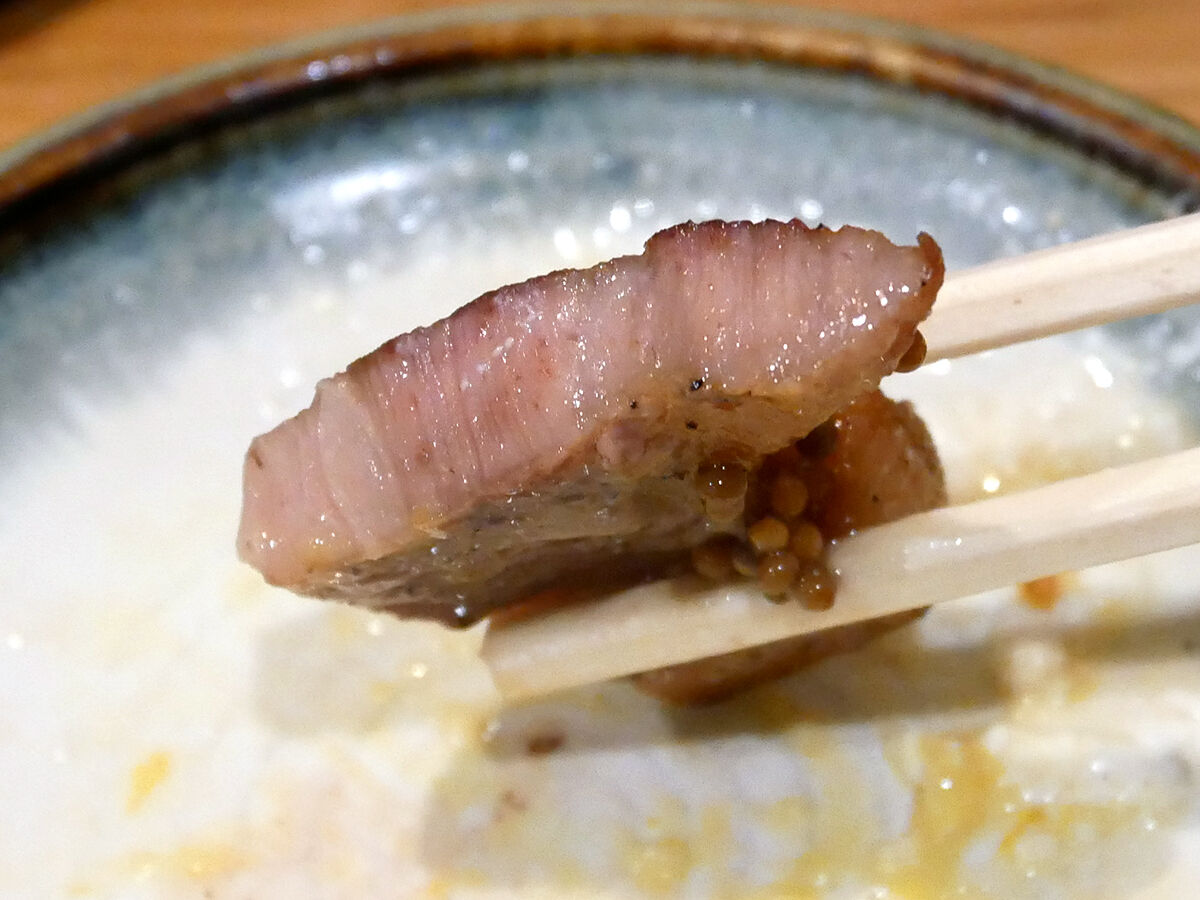 外こんがり香ばしく、キメ細かでやわらかジューシィ。ほんで脂身の甘いこと!しっかり霜降り!ながら、ベタッとしてなくてサラリと溶けてく脂!臭みも全くないし、ほんま食べた感じが軽ーい!