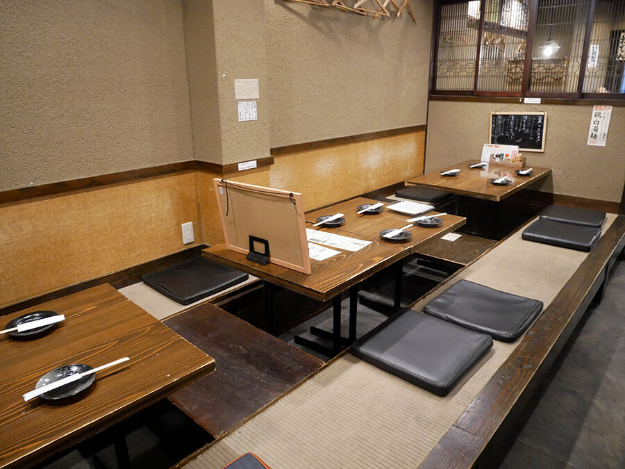 店内は調理場向かいのカウンター、各所テーブル席に小上がりの掘り炬燵席もあってなかなかゆったり。