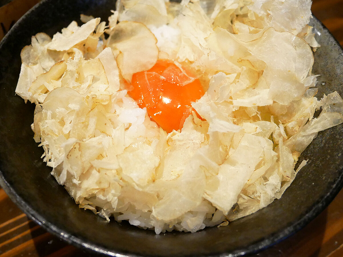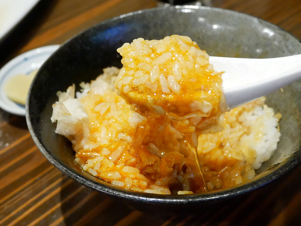 まずは混ぜずにそのままご飯とともに、そして濃い卵黄を潰してかき混ぜて〜