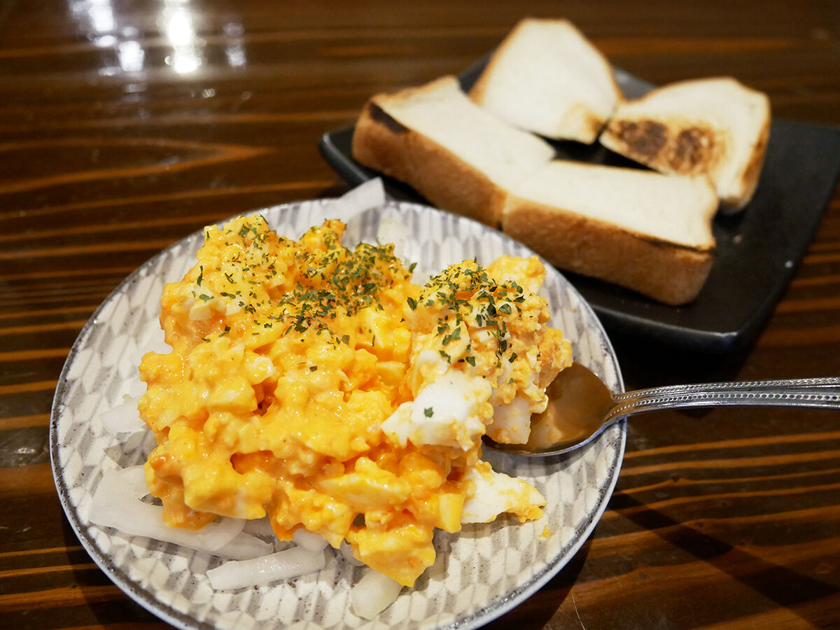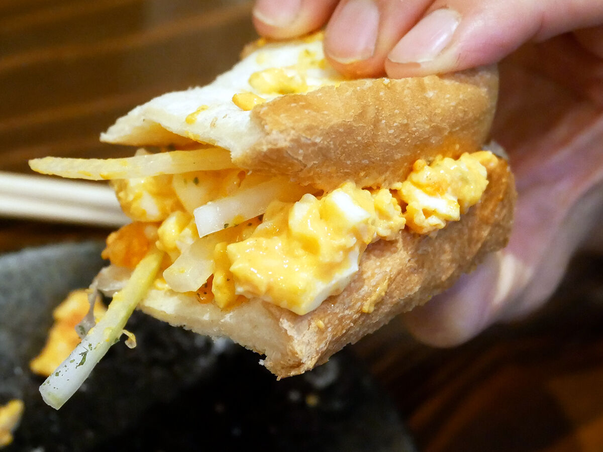 濃厚玉子サラダに辛味のあるシャキシャキ生玉ねぎを合わせて。