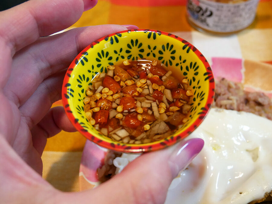 そしてガパオの時にも使う、<ナンプラープリック>=ニンニク、唐辛子、マナオ(ライムやスダチなどの柑橘で代用)の調味料も用意して。 もともとしっかり辛いけど唐辛子も加えてさらに辛さアップ!夏は辛い料理で汗をかくのが良い!