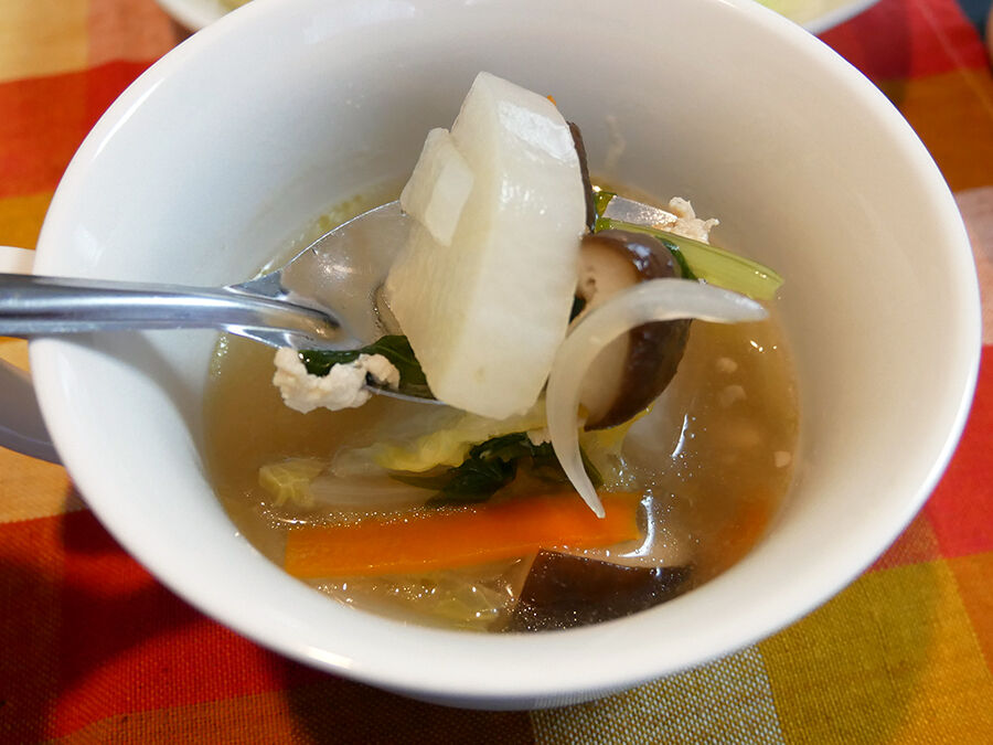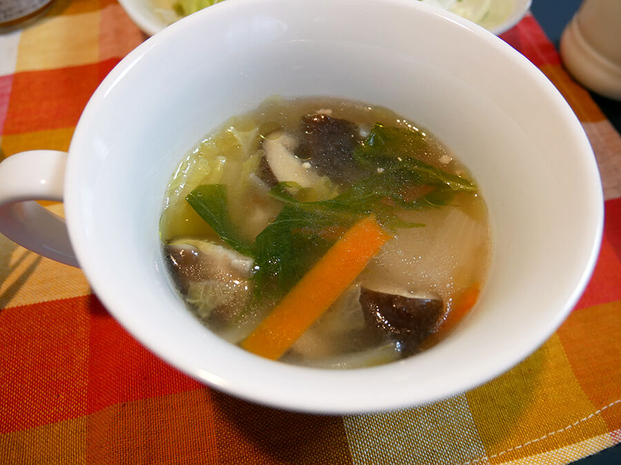 カレーともう一品は、<ゲーン・チュー>=クリアなスープ タイの椎茸スープの素をお湯に溶かして、残り野菜をブチ込むだけ。