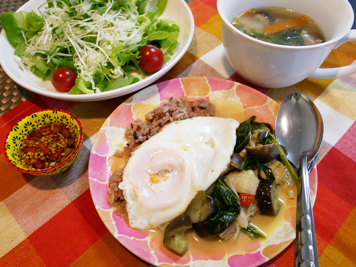 いつも通り、タイ米に目玉焼きオンザでいただきまーす 具材は、鶏胸肉、なす、しめじ、バジルのオーソドックスなのいっといた。