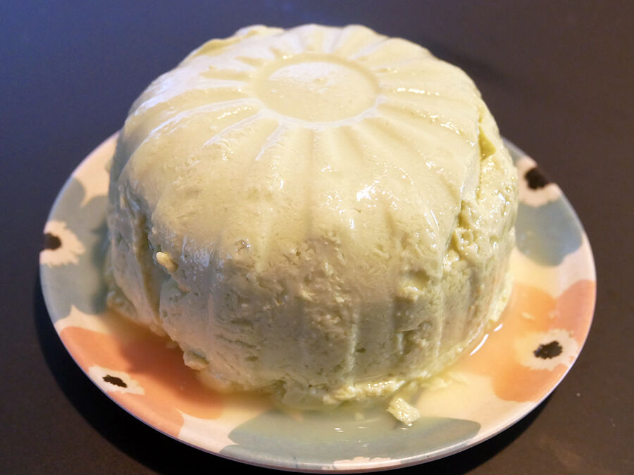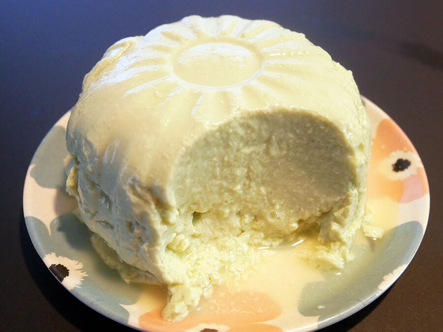よせ豆腐っぽい「よせ固めました!」って感じなちょっとザラつきのあるビジュアルに、薄っすら緑色。