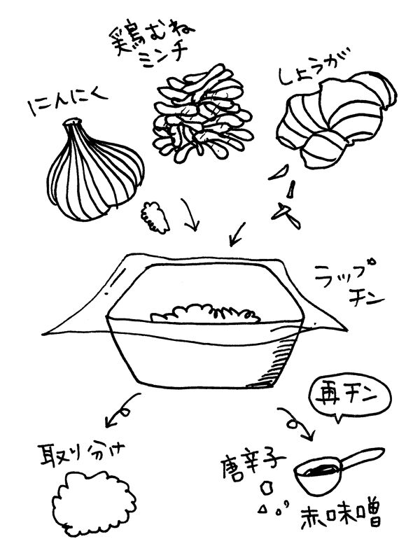 1.耐熱皿にミンチと生姜とにんにくを入れ料理酒をふり、ラップをかけてレンチン(3分ほど)