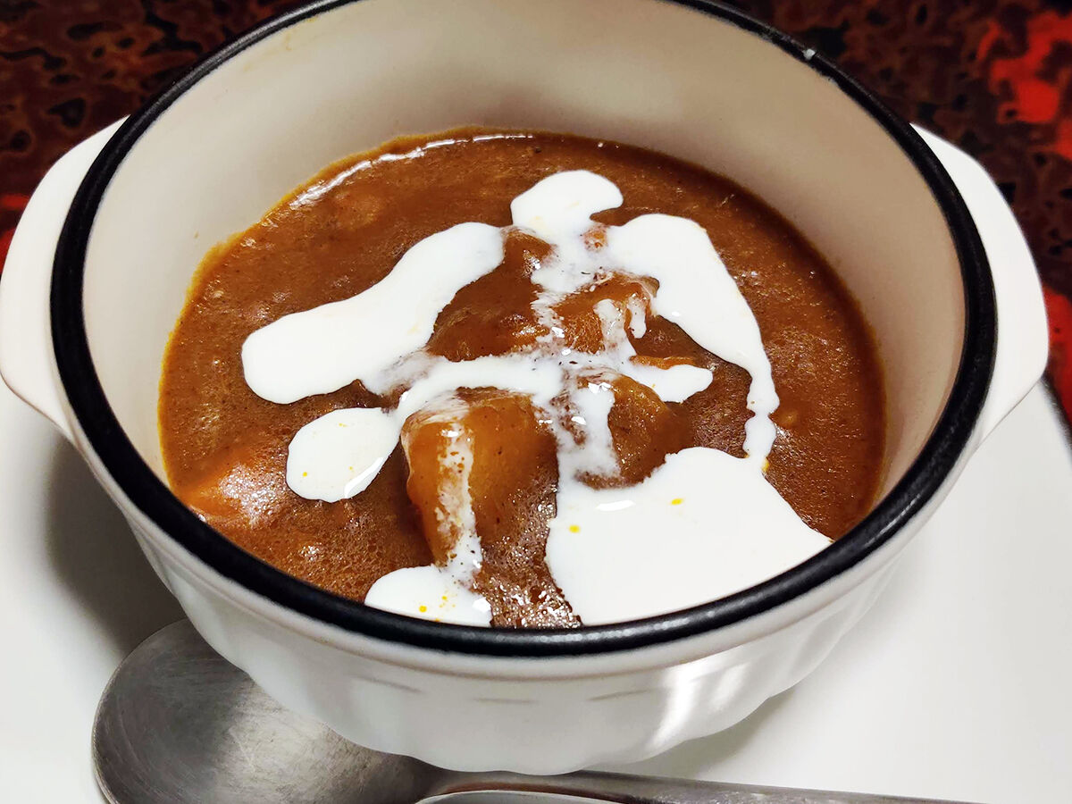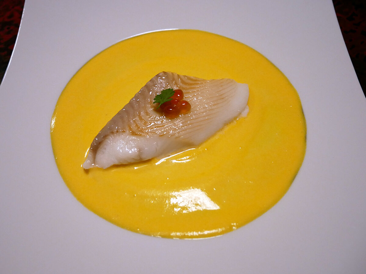 おっきな白い器にオレンジ黄色のソースが鮮やか、フレンチの一品みたい。