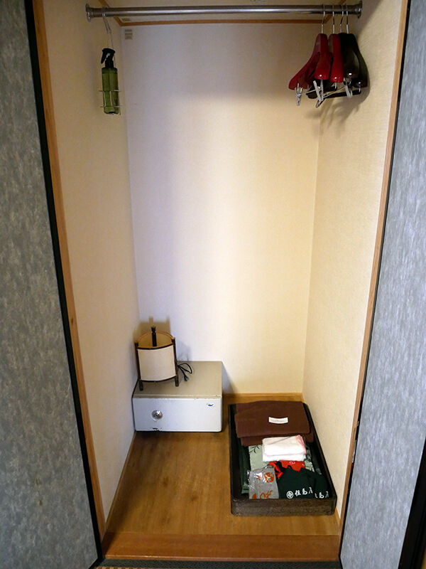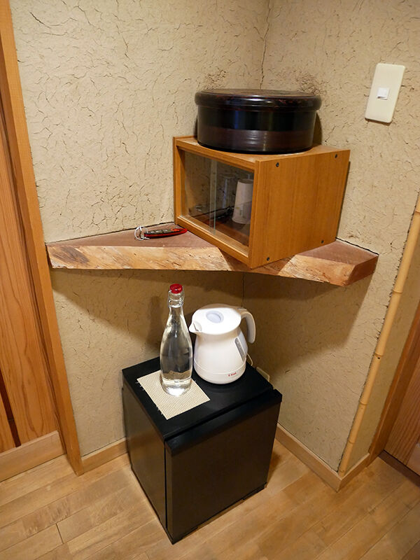 お部屋のアメニティは必要最低限。化粧水やヘアゴムなどは先の売店前にてセルフでもらえます。無駄なし。
