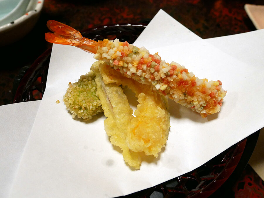 季節の天婦羅:五色海老、枝豆玄米揚げ、黒皮南瓜、丸茗荷