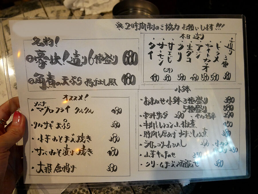 アテは魚介系がウリ。お造りや焼きもん揚げもんなどに、その他小鉢もんアレコレ。