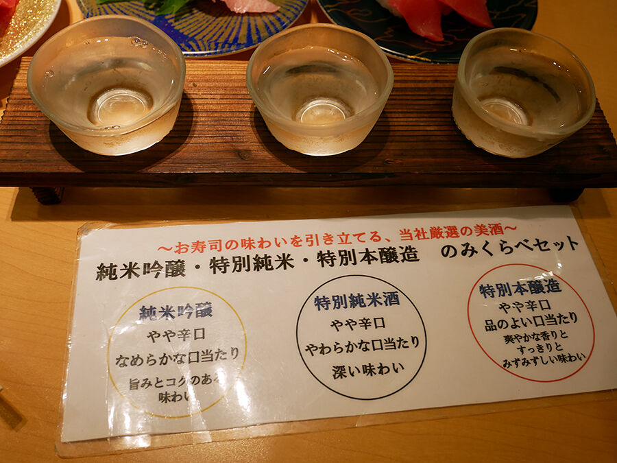 お店オリジナルの日本酒。純米吟醸・特別純米酒・特別本醸造の3種をそれぞれ60mlずつ。