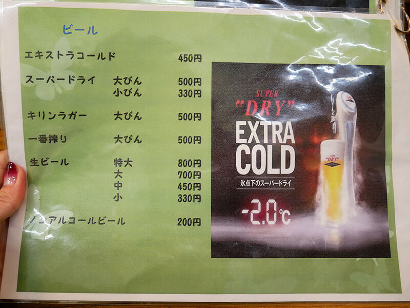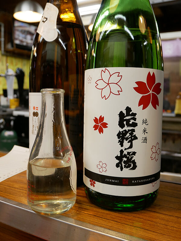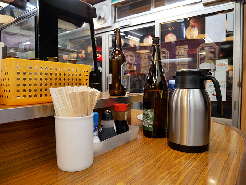 店名入りの看板&提灯に、酒メーカーの提灯もブラブラ。同じく店名入りの暖簾は裏返して掛かっている。何か商売繁盛的な意味があるんだっけ?知らんけど。