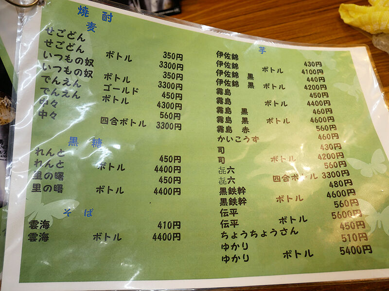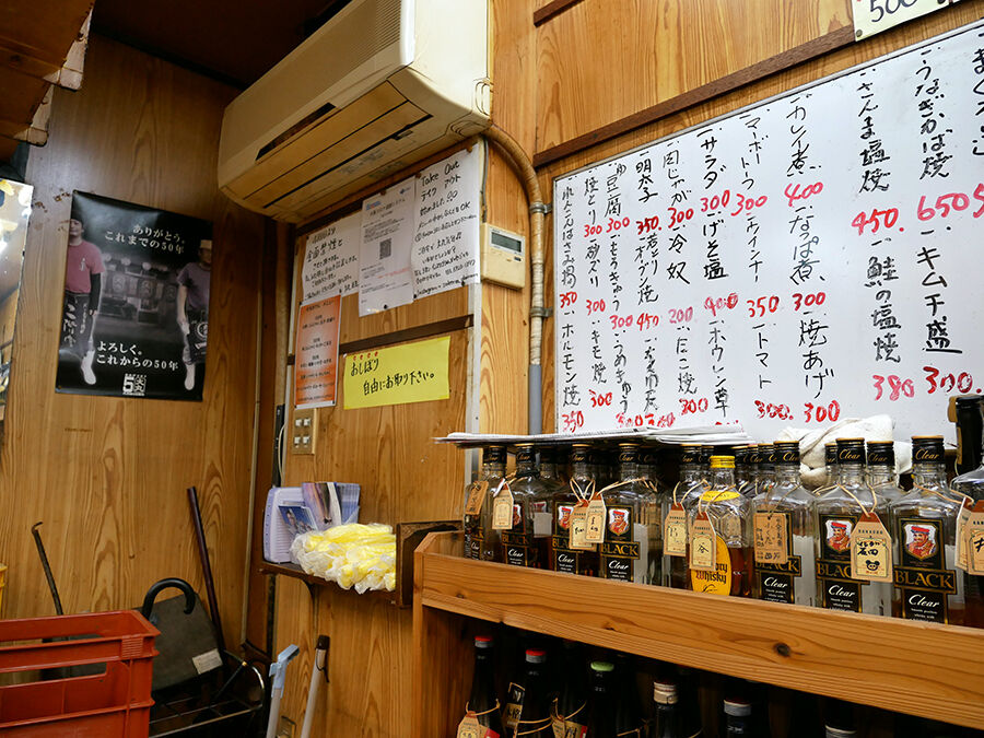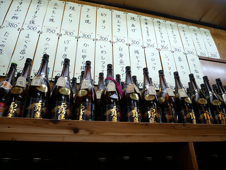 背後には、焼酎やウイスキーのキープボトルがずらり!めちゃくちゃすごい数!!常連度の高さを物語っている。