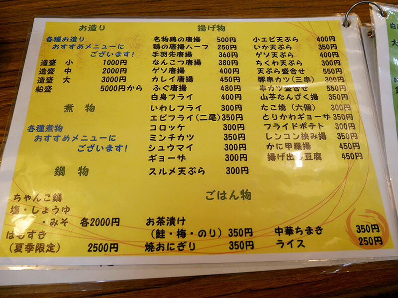 アテはおつまみ一品、お造り、煮物、揚げもん、焼きもん、おでん、お鍋、シメもんなど、居酒屋定番網羅プラスαでバリエ豊富。こーゆうのん、めちゃめちゃ好き♡(詳細は生地最下部にてどうぞ。)