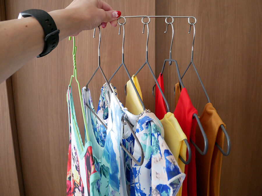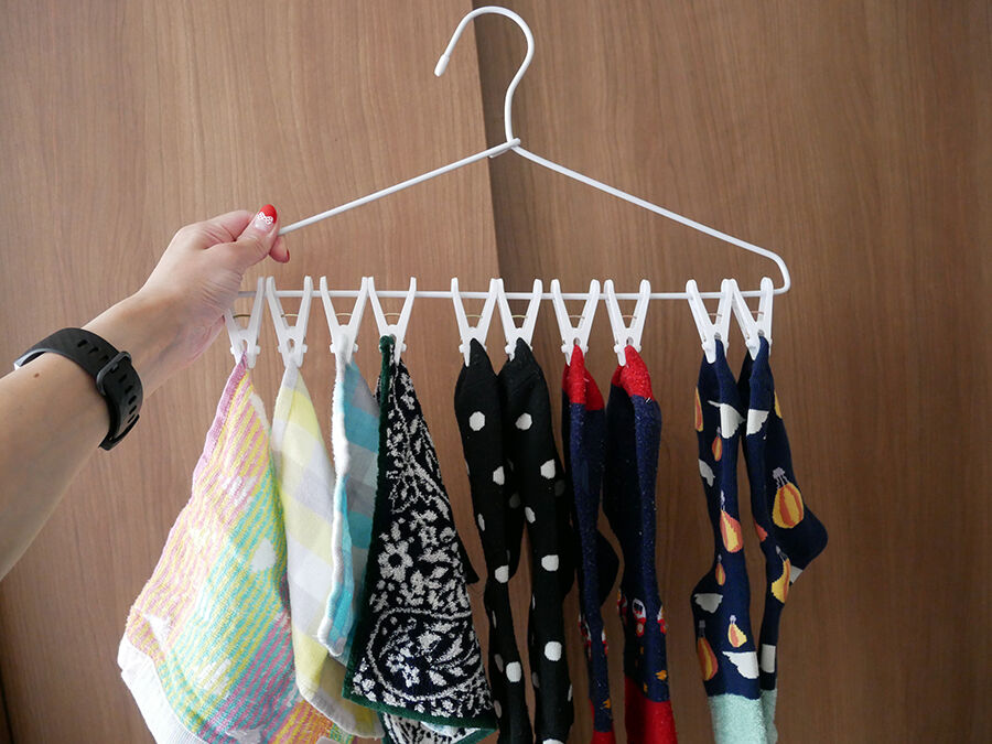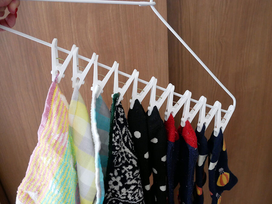 ひとつのハンガーに10個のピンチがついていて、靴下とかハンカチとか、ちょっとしたものを一度に干せるの。
