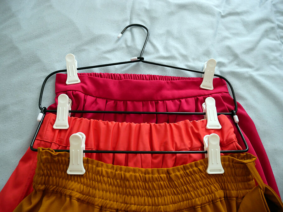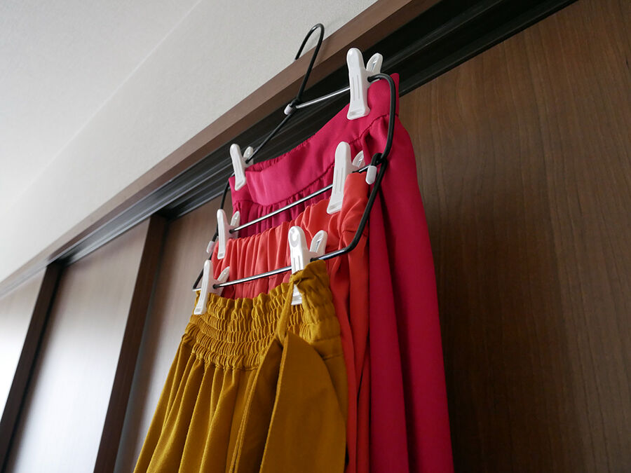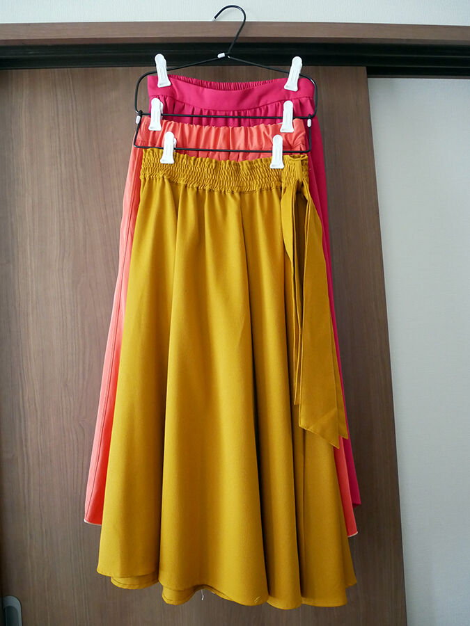 これまで、スカート3枚=ハンガー3本だったのが1本に収まり、収納の『幅』が減った。もっと買おうっと。