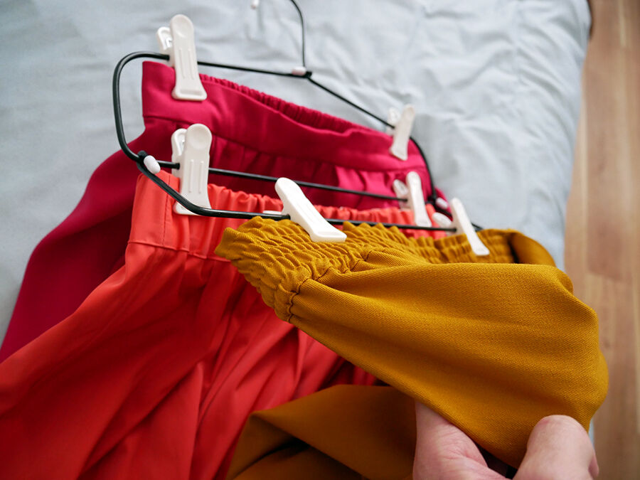 1本のハンガーで3枚のズボンを挟んで収納できるという優れもの。