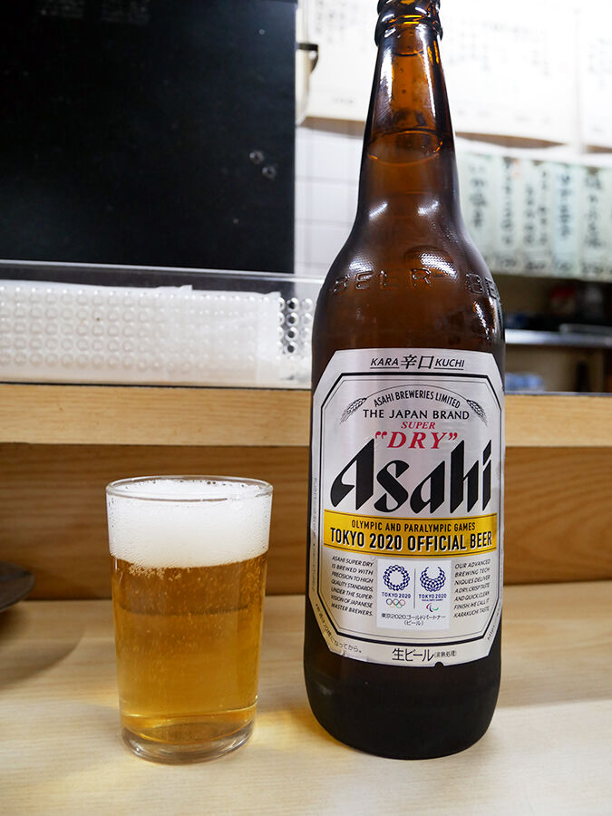 この店には瓶ビールが合う。カウンターでひとり手酌でヤルのが最高やねん。