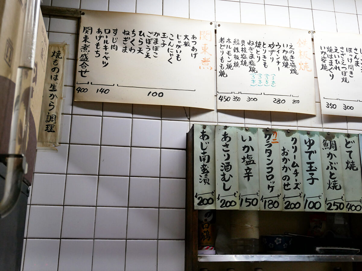 おつまみ一品、関東煮(おでん)、焼きもん、揚げもん…なんでもござれな素晴らしいラインナップ。そしてその安さに毎度目を疑うっ
