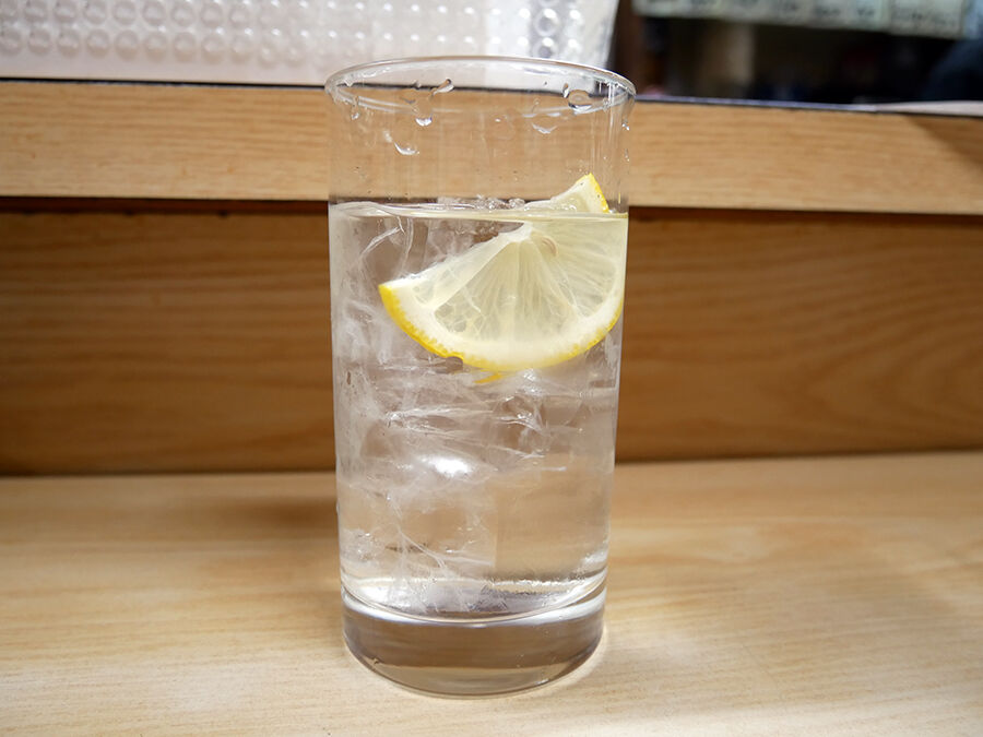 ロックだけどコップグラスにたっぷり。ひと切れのレモンが泣かせる。