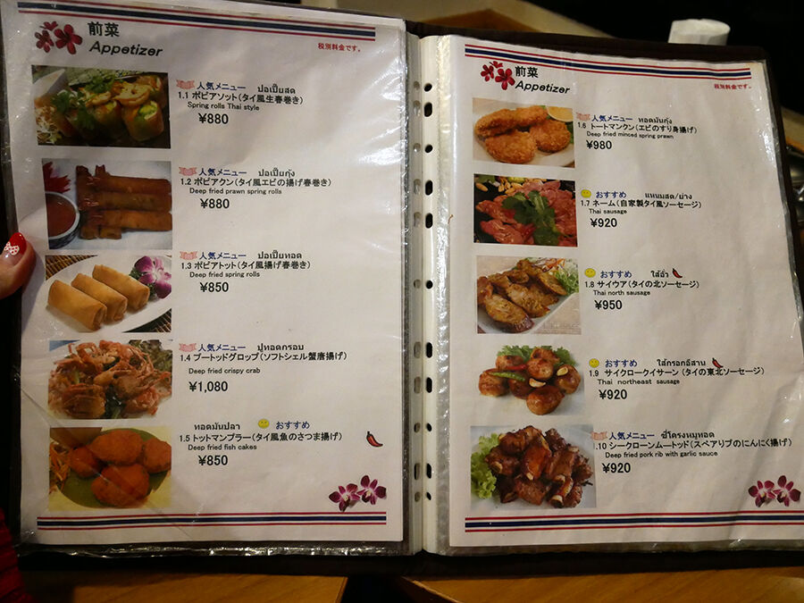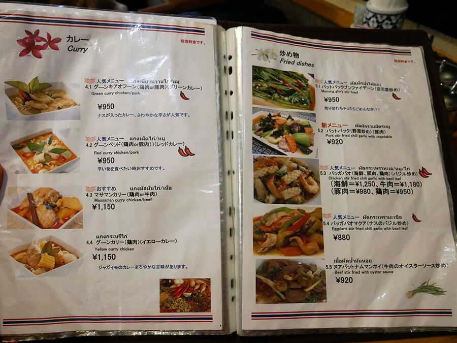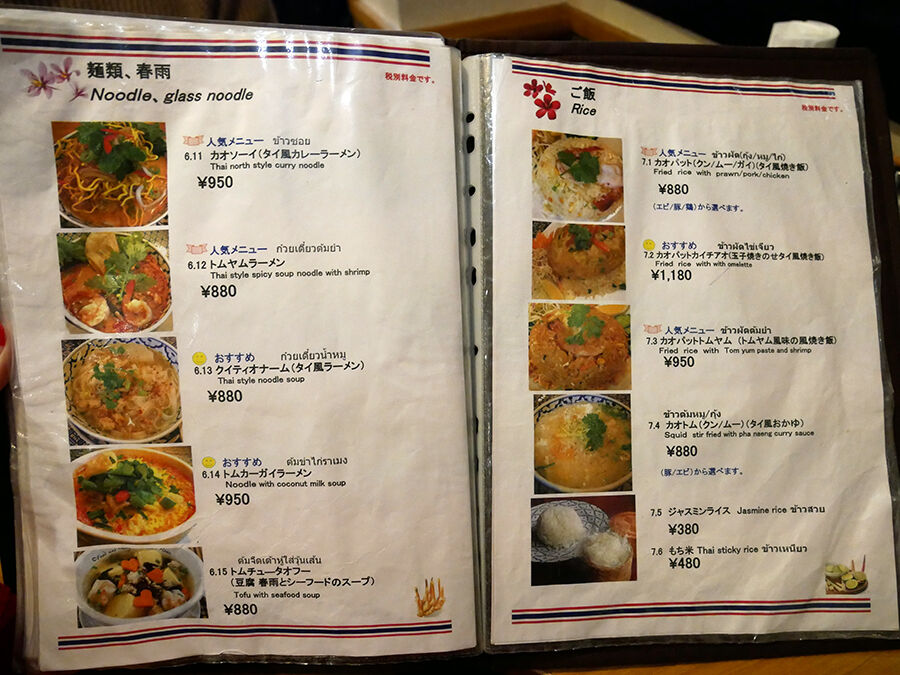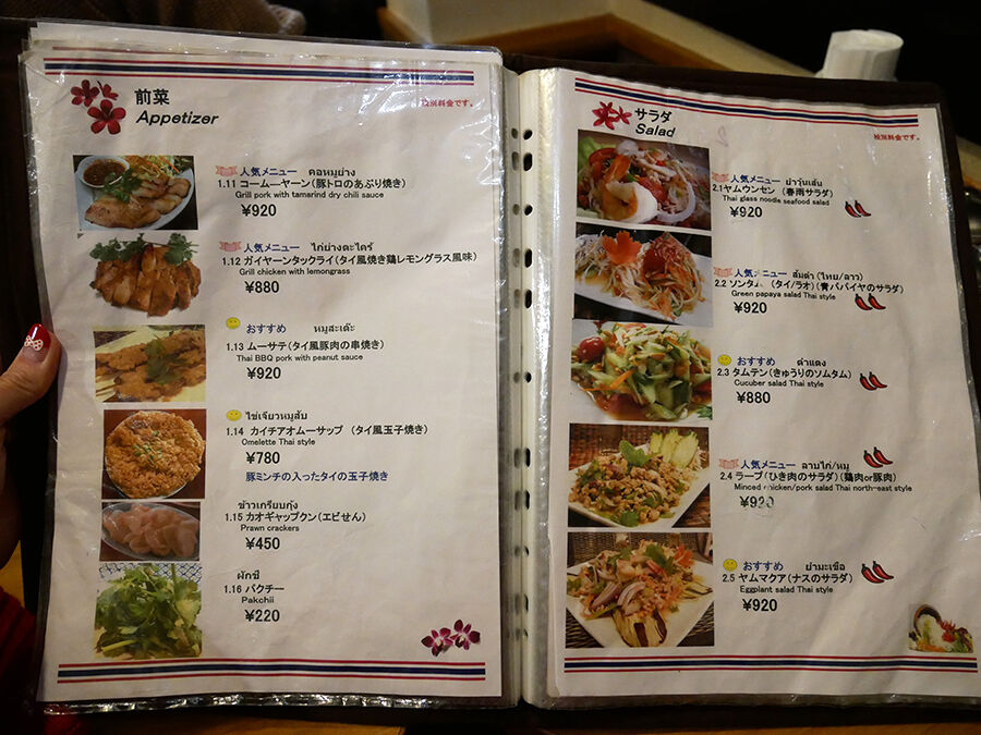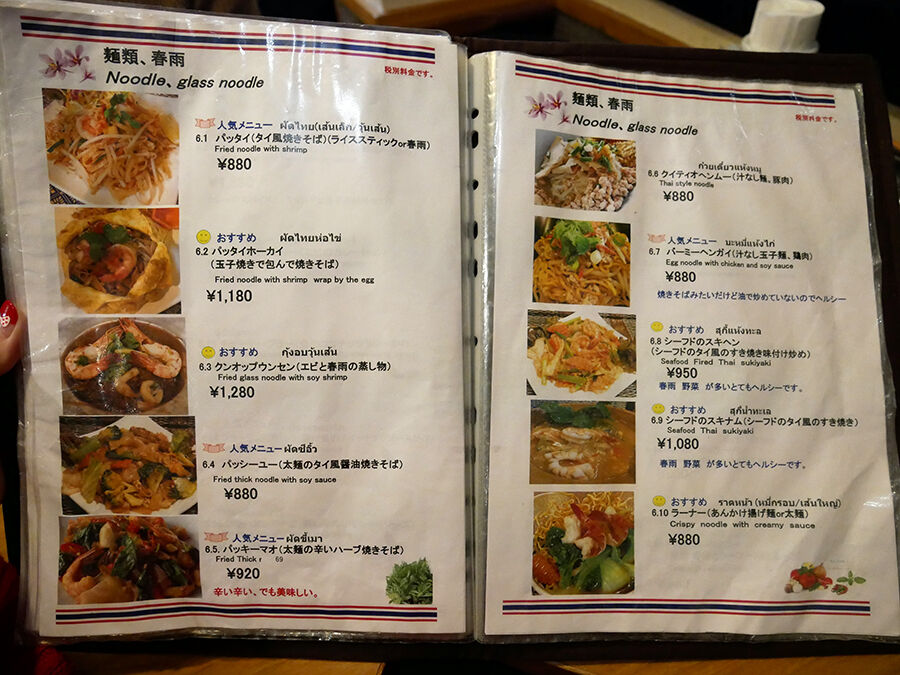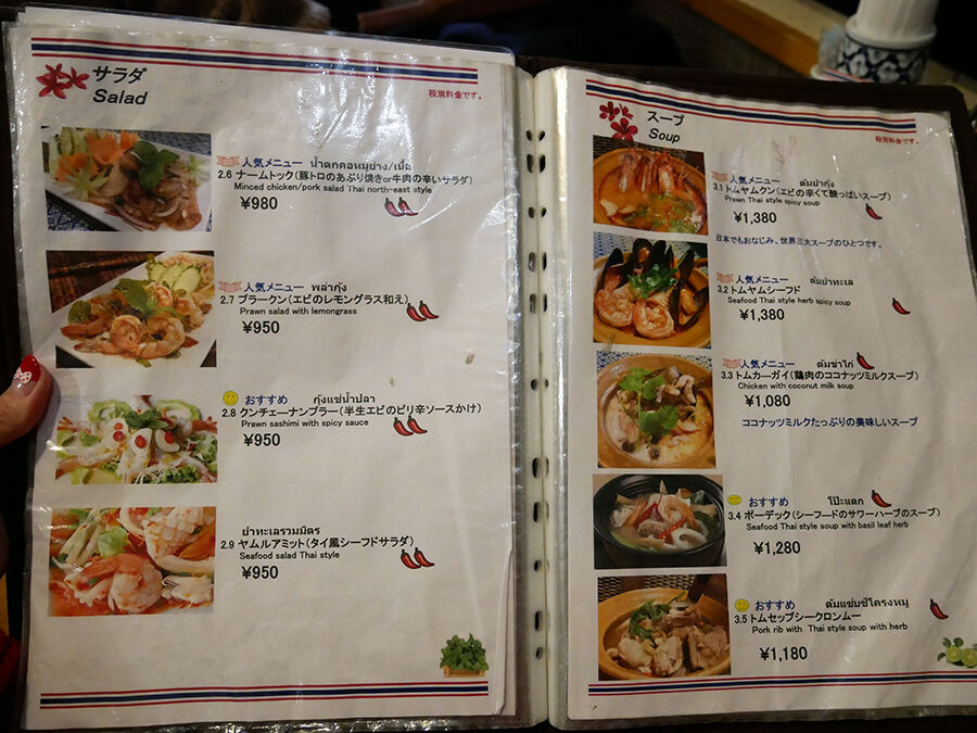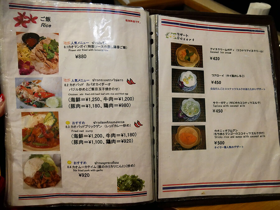 メニューは手元ブックにて。タイ語の日本語読み&説明書きで記され、全て写真入りでタイ料理に詳しくなくても安心^^(詳細は記事最下部にてどうぞ。以下、価格は税別。)