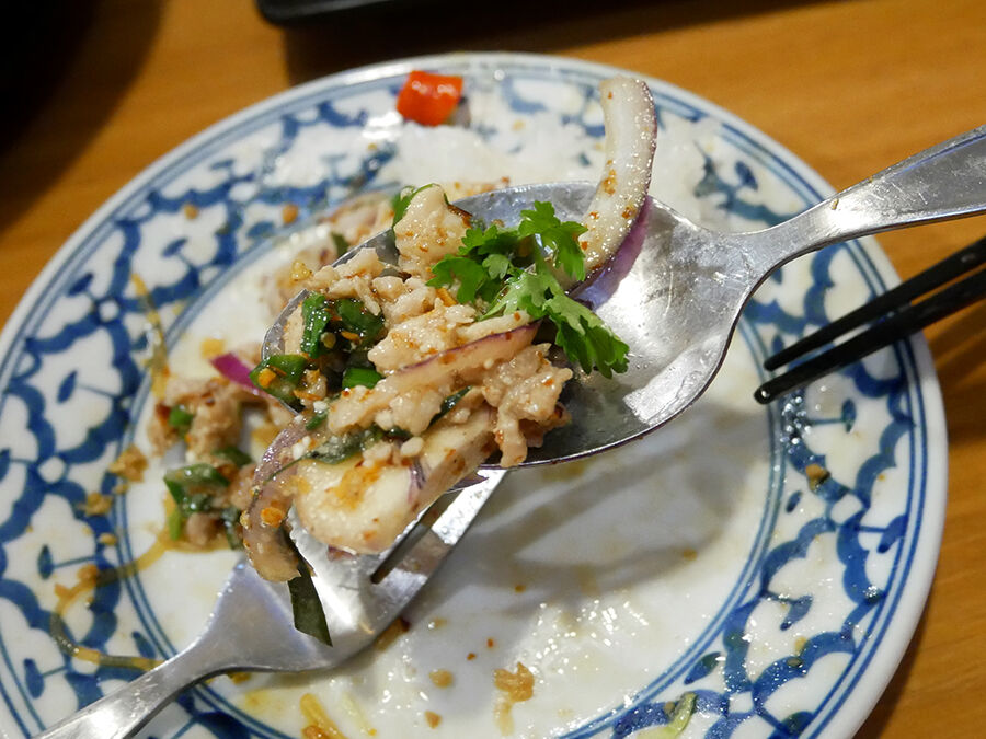 タイの人は基本、フォーク&スプーンで食すのでそのセットプラスお箸もスタンバイ。