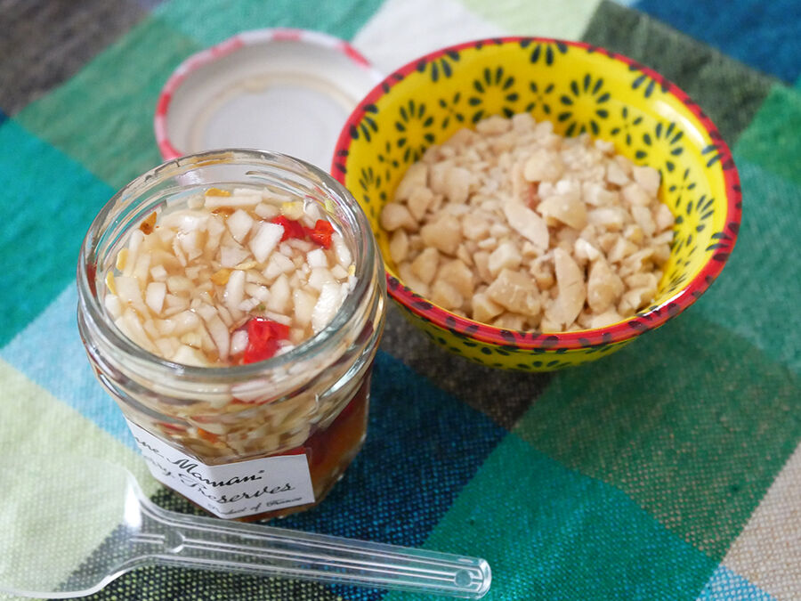 パッタイに欠かせない砕いたピーナッツと、タイ料理におなじみの<ナンプラープリック>もスタンバイOK