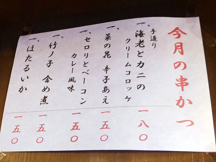 メインの串かつに加え、おつまみ一品、関東煮、シメ炭水化物など。(詳細は記事最下部にてどうぞ。以下、価格は税別。)