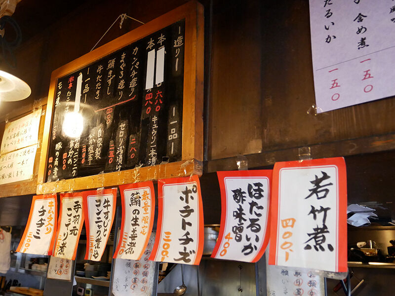 メニューは手元パウチに定番が、その他、店内あちこちにも短冊や黒板で掲げられます。