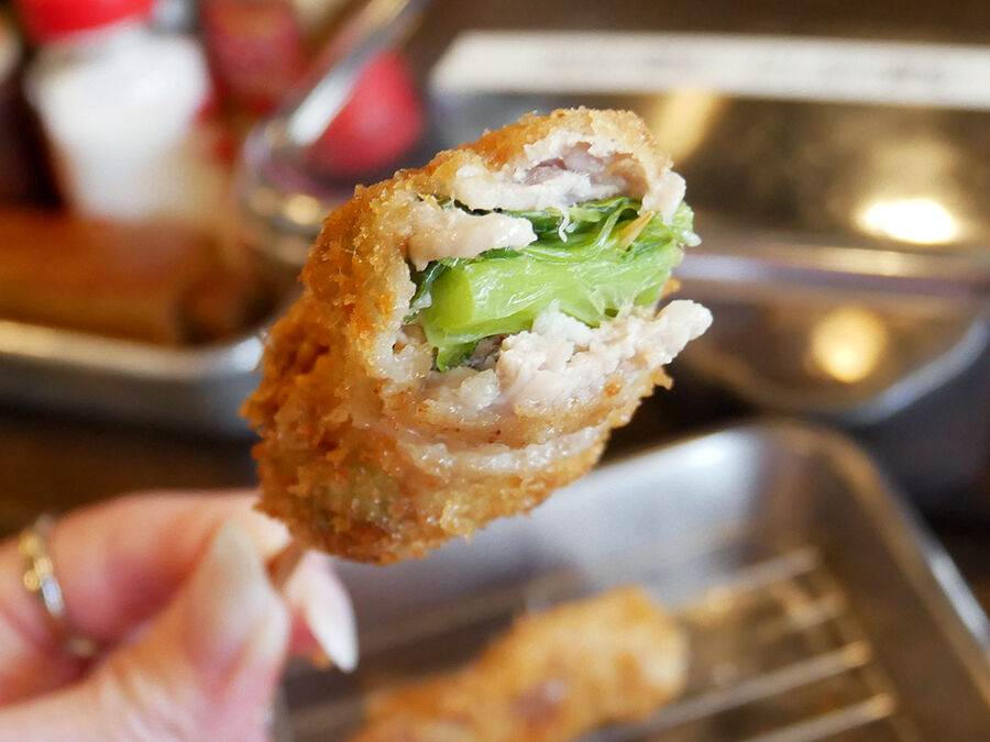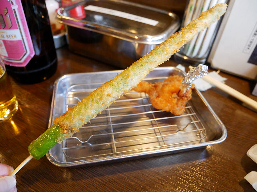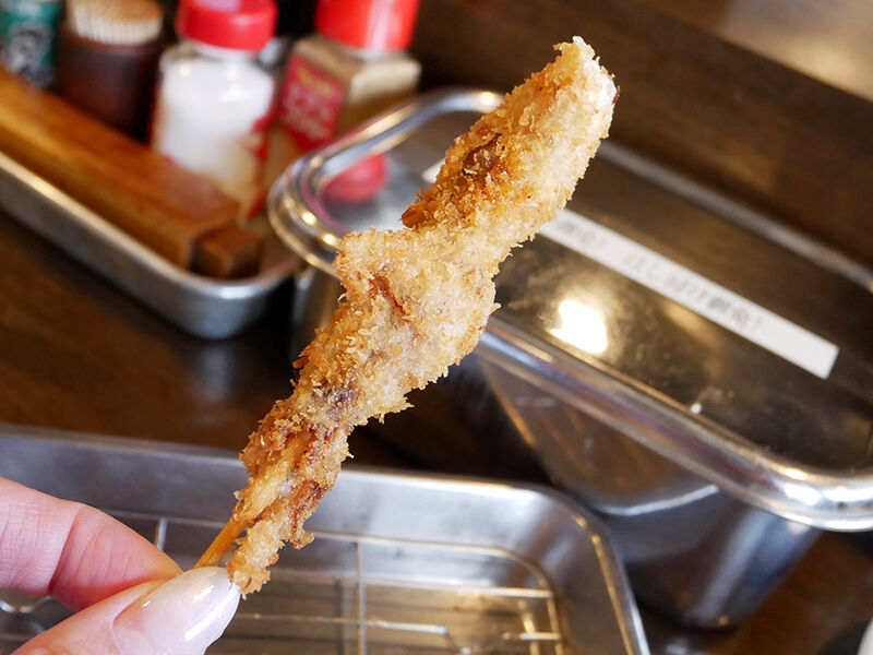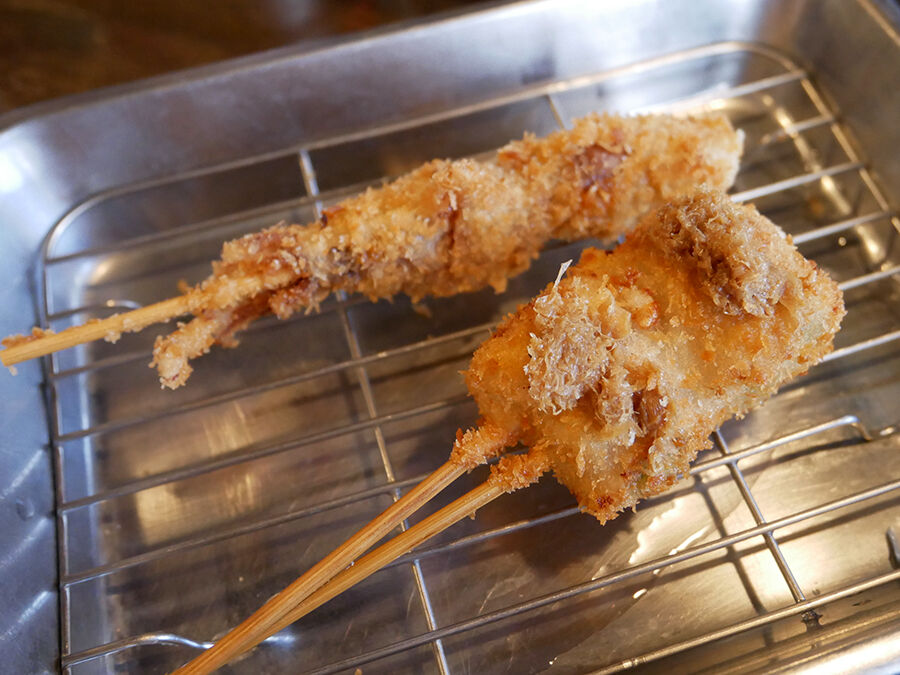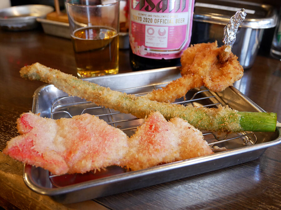 ケースに並ぶ串刺しにされたネタを、オーダー後に衣をつけて揚げ、小さいバットにサーブされるスタイル。良き。