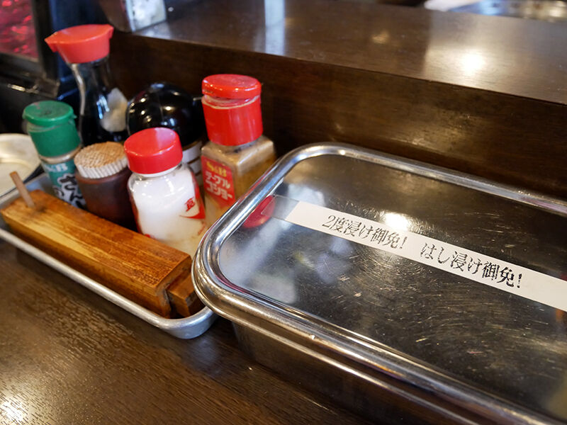 手元には割り箸(袋入り)や各種調味料、串かつソースなどがスタンバイ。