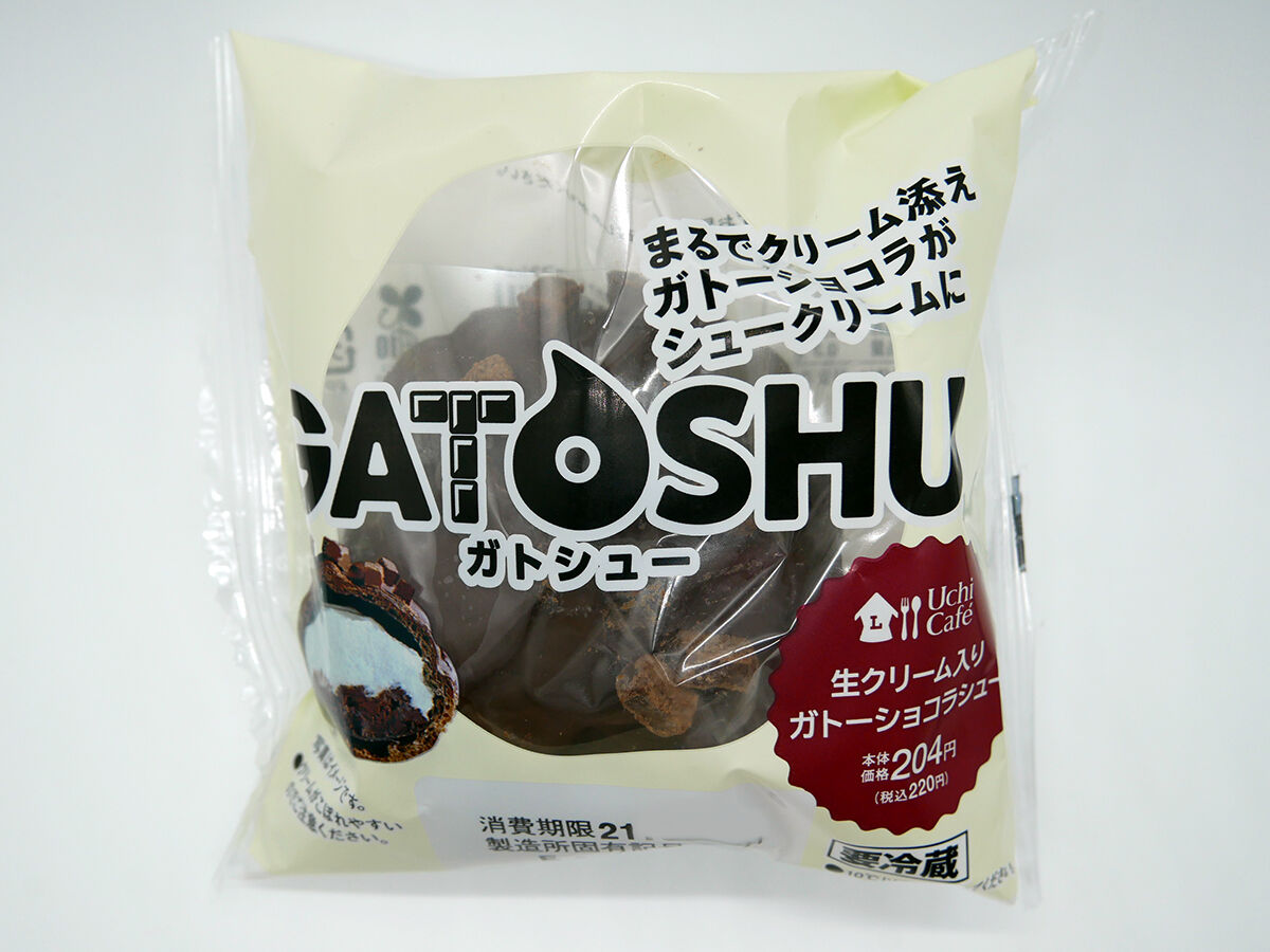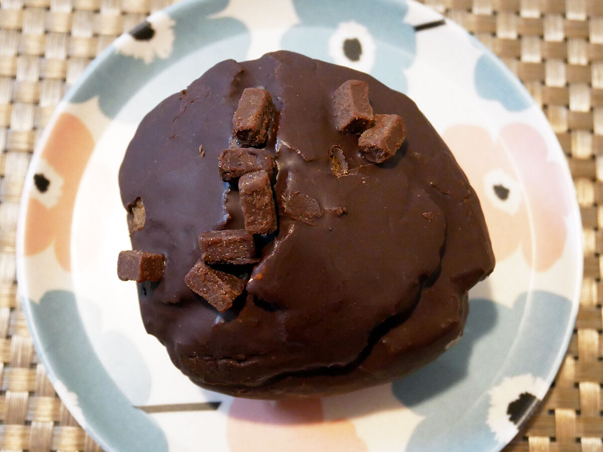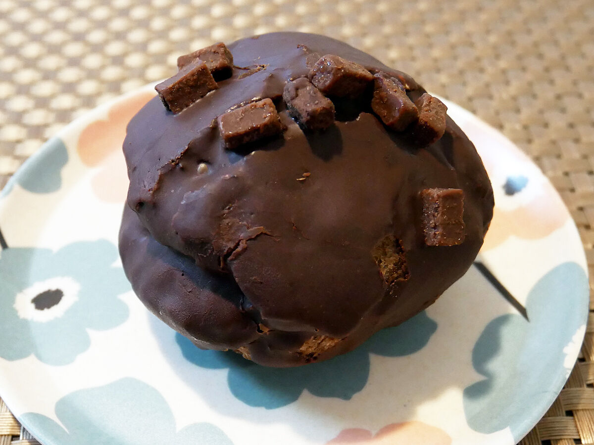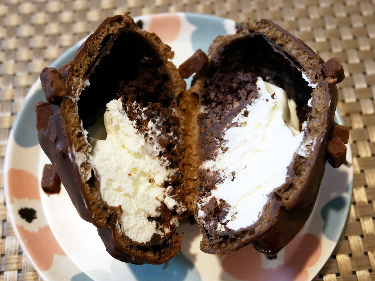 冷蔵していたのでしっかりチョココーティングがほどよくパリッと、やや厚みあるシューパフ生地と合わさって、歯がクイッと食い込むしっかり目な存在感。